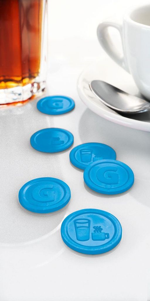 Blaue Wertmarken "Getränke" aus stabilem Kunststoff mit hochwertiger Reliefprägung. Zu sehen ...