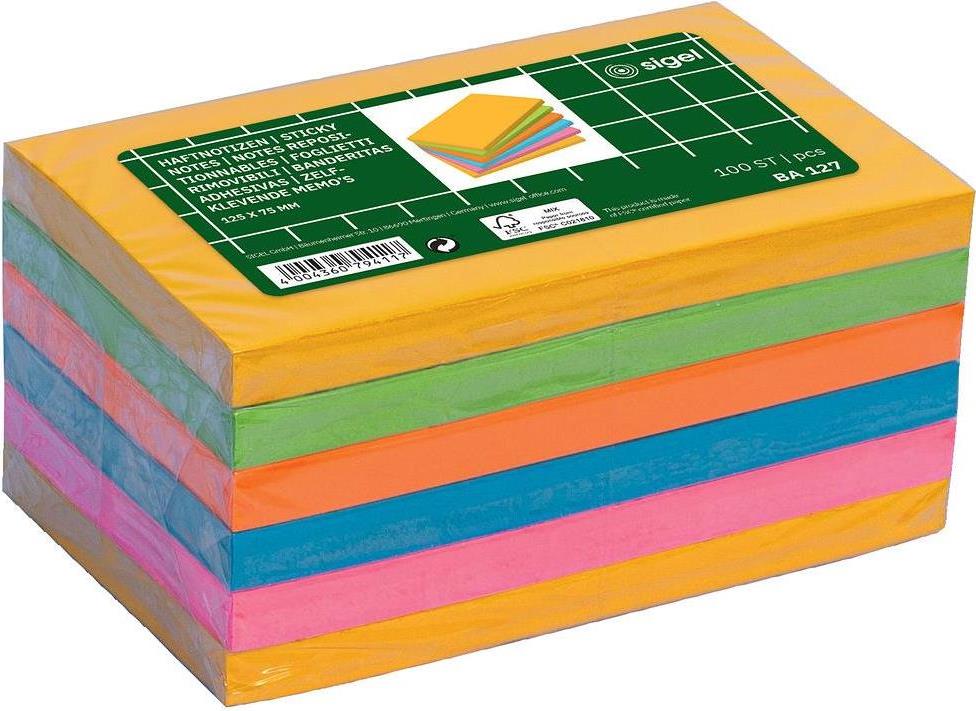 Sigel BA127. Formfaktor: Rechteck, Produktfarbe: Blau, Grün, Orange, Pink, Gelb, Material: Papier. Breite: 125 mm, Tiefe: 75 mm, Gewicht: 328,5 g. Anzahl der Blätter pro Block: 100 Blätter, Verpackungsart: Polybag. Nachhaltigkeitszertifikate: Forest Stewardship Council (FSC). Ursprungsland: Deutschland (BA127)