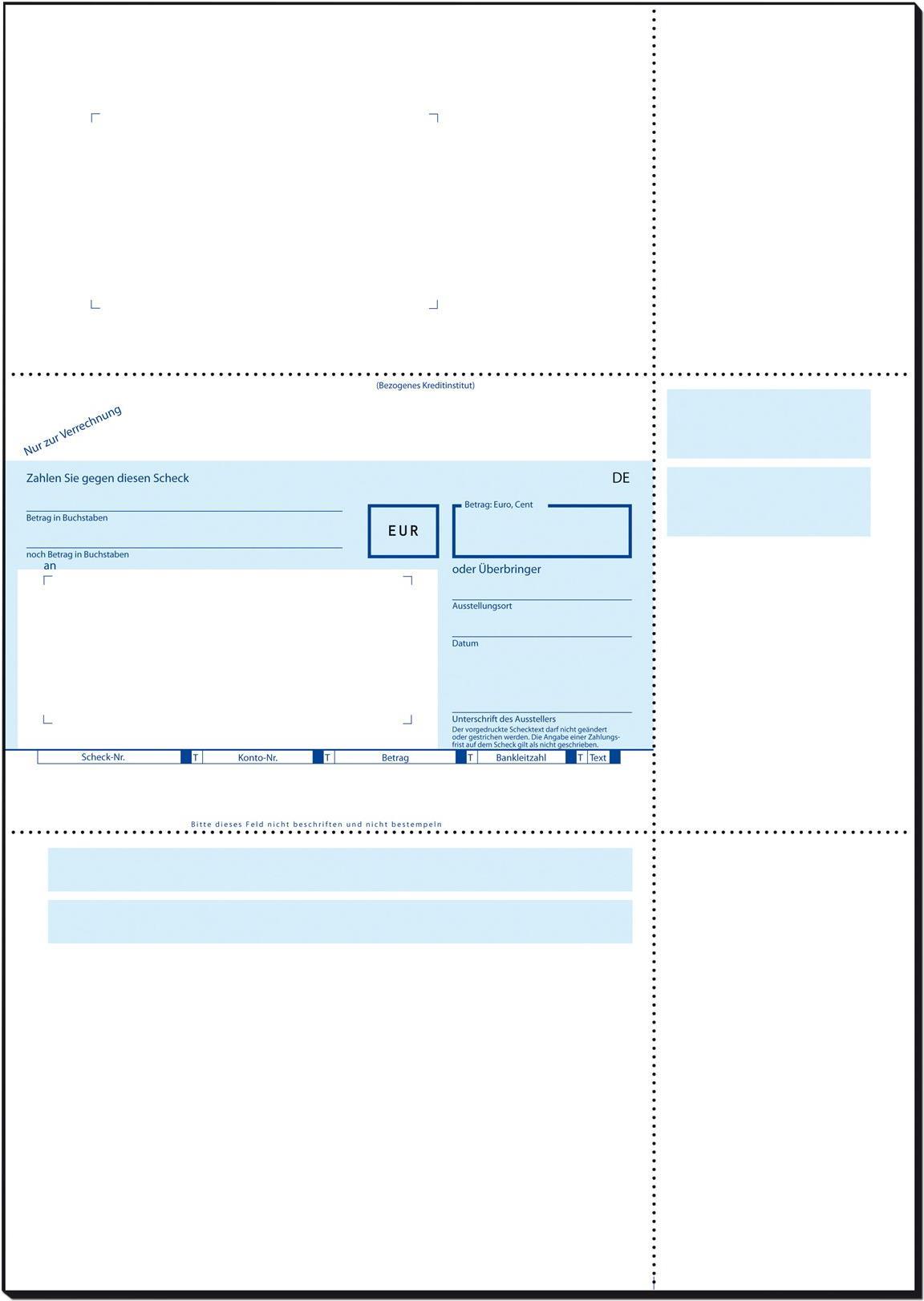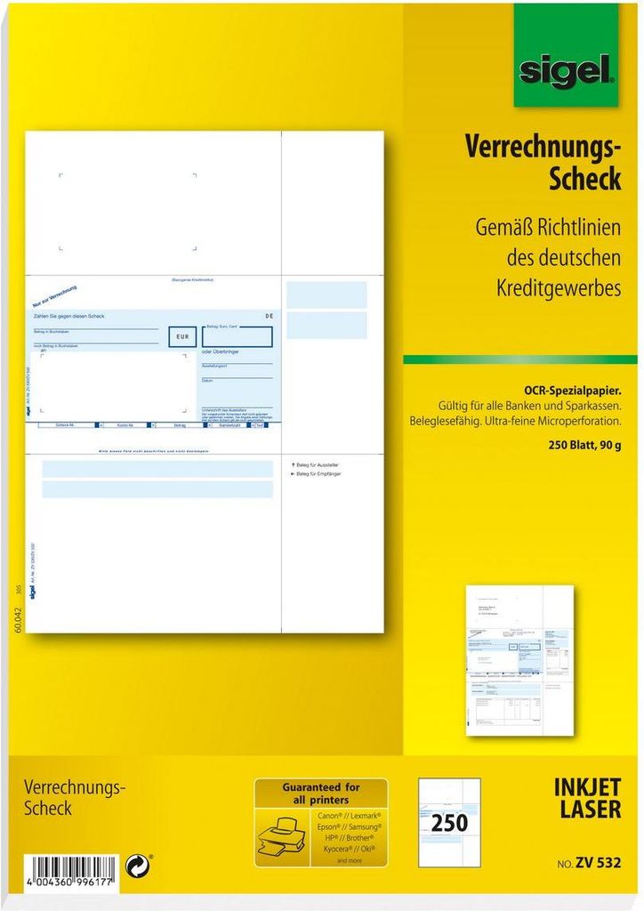 Verrechnungs-Scheck zum Ausfüllen mit PC und Drucker. Gültig für alle Banken und Sparkassen. Beleglesefähiges OCR-Spezialpapier in 90 g/m , geeignet für alle InkJet- und Laser-Drucker. Die ultrafeine Microperforation sorgt für leichtes Abtrennen der Formulare und exakte Kanten. Im Lieferumfang sind 250 Blatt im Format DIN A4 enthalten.