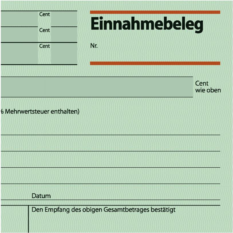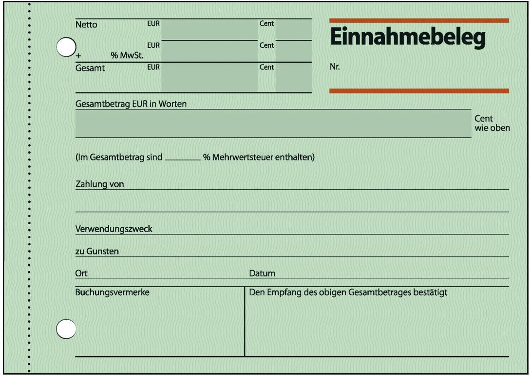 Einnahmebebeleg im Format DIN A6 quer mit 50 Blatt. FSC zertifiziert, aktuell und rechtssicher. Mit Empfangsbestätigung, MwSt.-Nachweis und fälschungssicherem Dokumentendruck auf allen Blättern. Alle Blätter farbig (hellgrün) mit Abheftlochung und ultrafeiner Microperforation für ein schnelles und sauberes Heraustrennen. Eine Sicherheitsbindung macht das Formularbuch besonders stabil und haltbar.