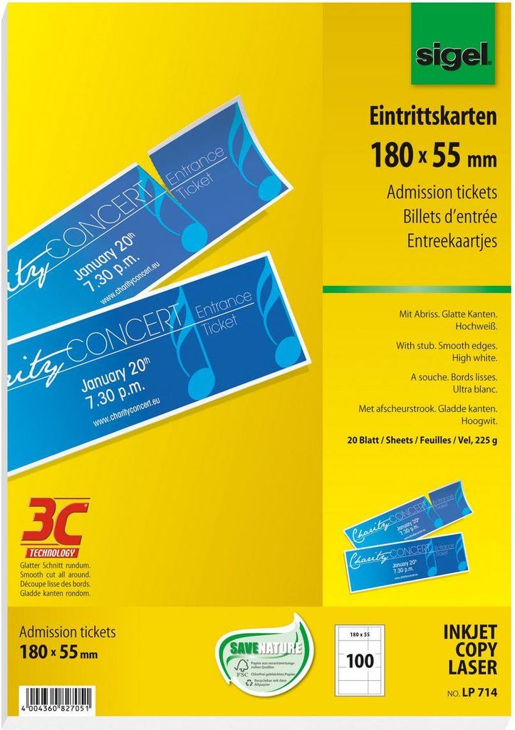 sigel Eintrittskarten, 180 x 55 mm, bedruckbar, hochweiß individuell gestaltbar, stabiler Edelkarton 225 g/qm, - 1 Stück (LP714)