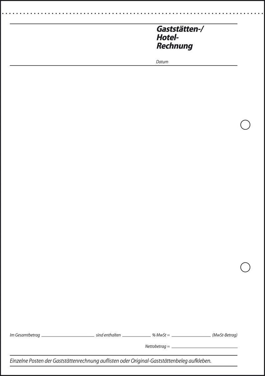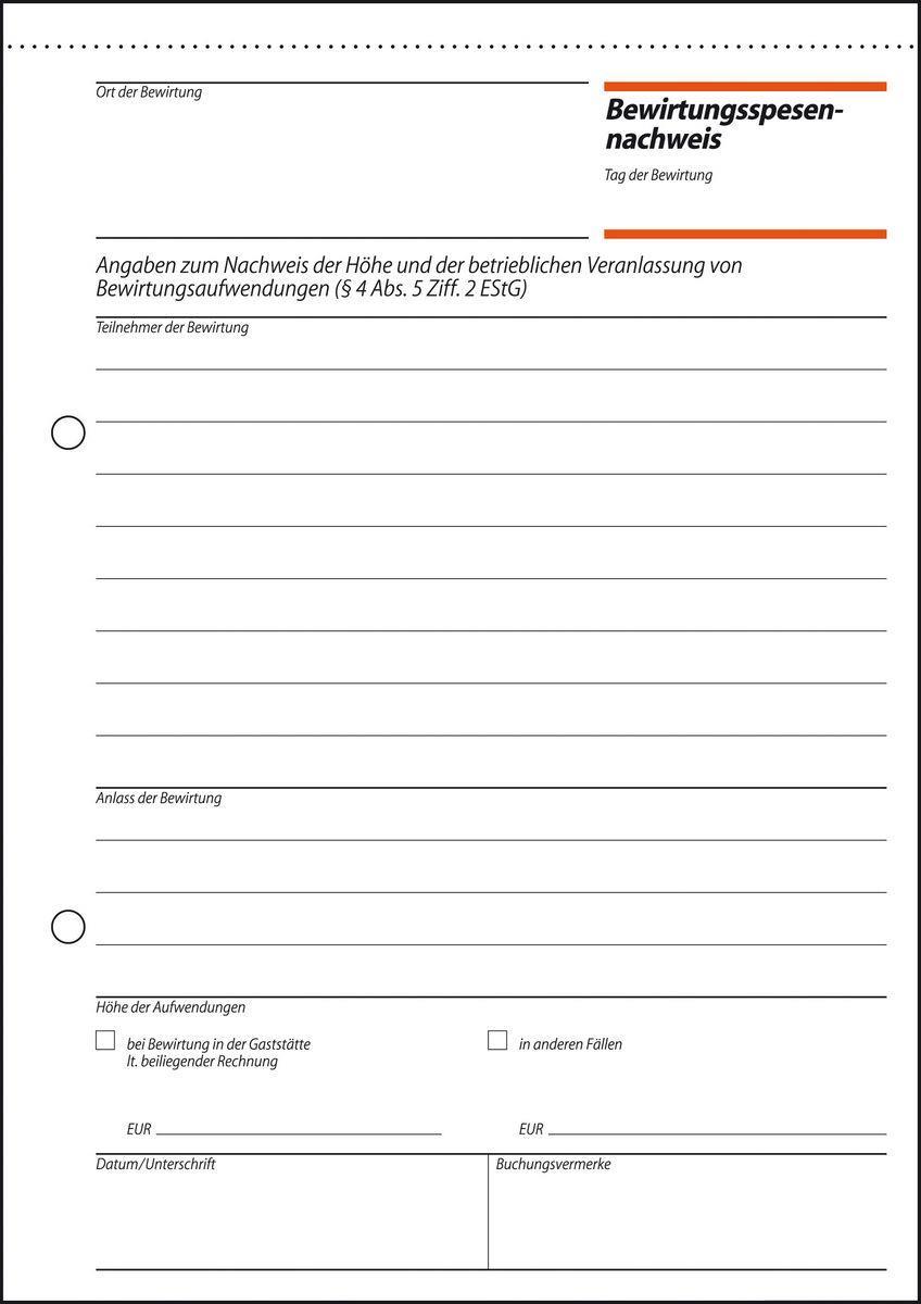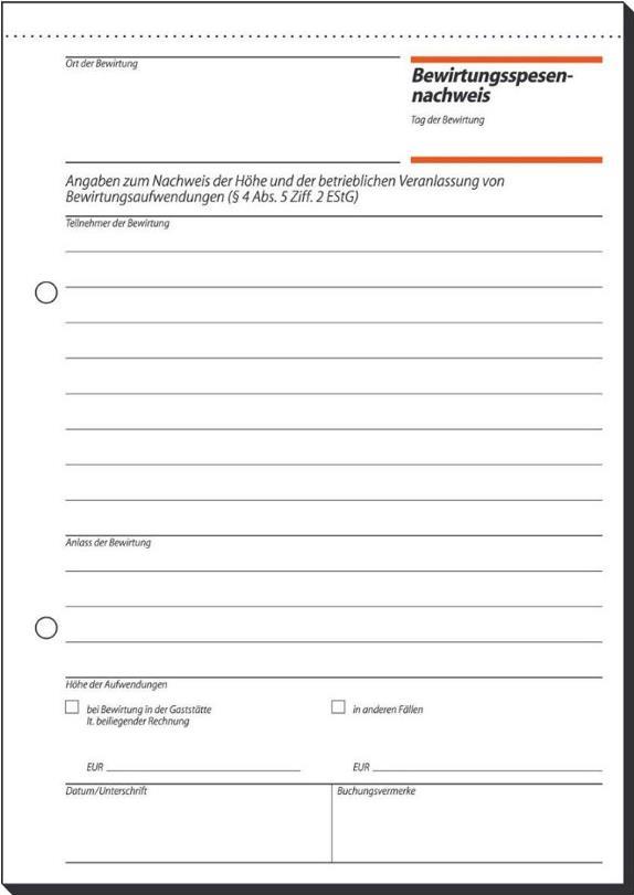 Bewirtungsspesennachweis/Gaststättenrechnung zum Nachweis betrieblich veranlaßter Bewirtungskosten. Abreißblock im Format DIN A5 mit 50 Blatt. FSC zertifiziert, aktuell und rechtssicher, mit allen Angaben, die das Finanzamt für die Anerkennung fordert. Alle Blätter mit Abheftlochung und ultrafeiner Microperforation für ein schnelles und sauberes Heraustrennen. Die Bewirtungsrechnung kann auf der Rückseite aufgeklebt werden. Eine Sicherheitsbindung macht das Formularbuch besonders stabil und haltbar.