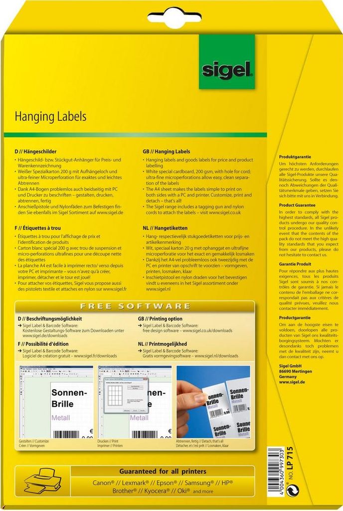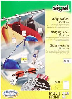 sigel Hängeschilder, 27 x 40 mm (A4), weiß, 200 g-qm, MP für Inkjet-Laser-Kopierer, Spezialkarton, Aufhängelochung (LP715)
