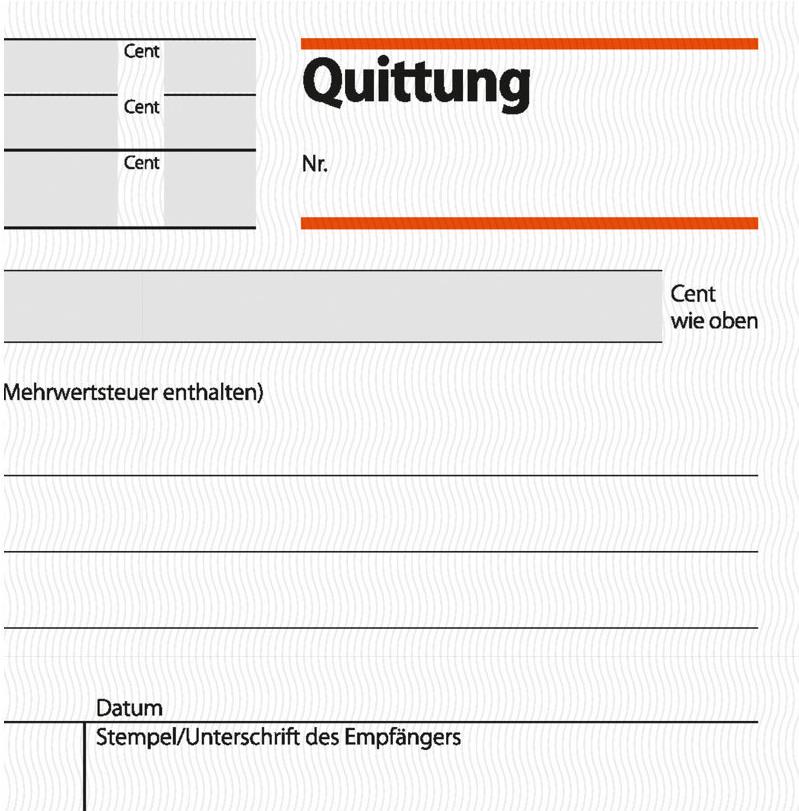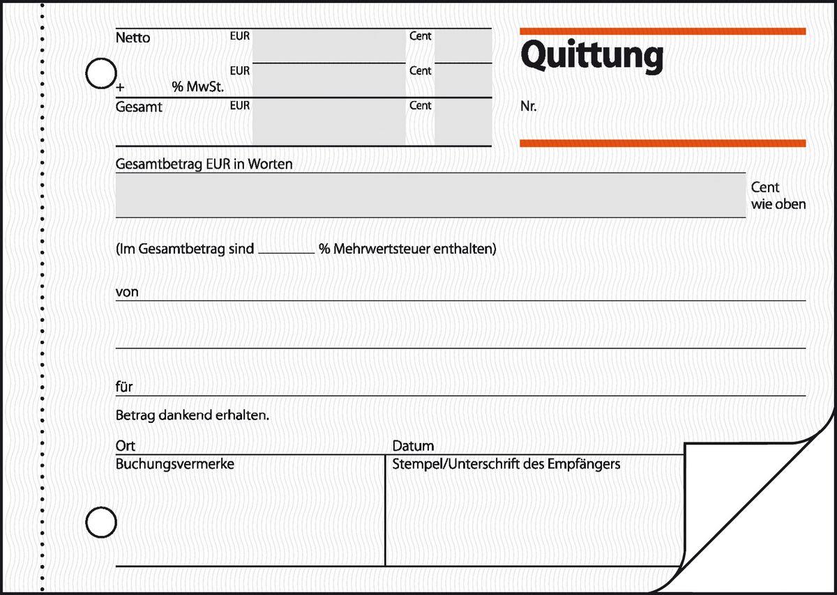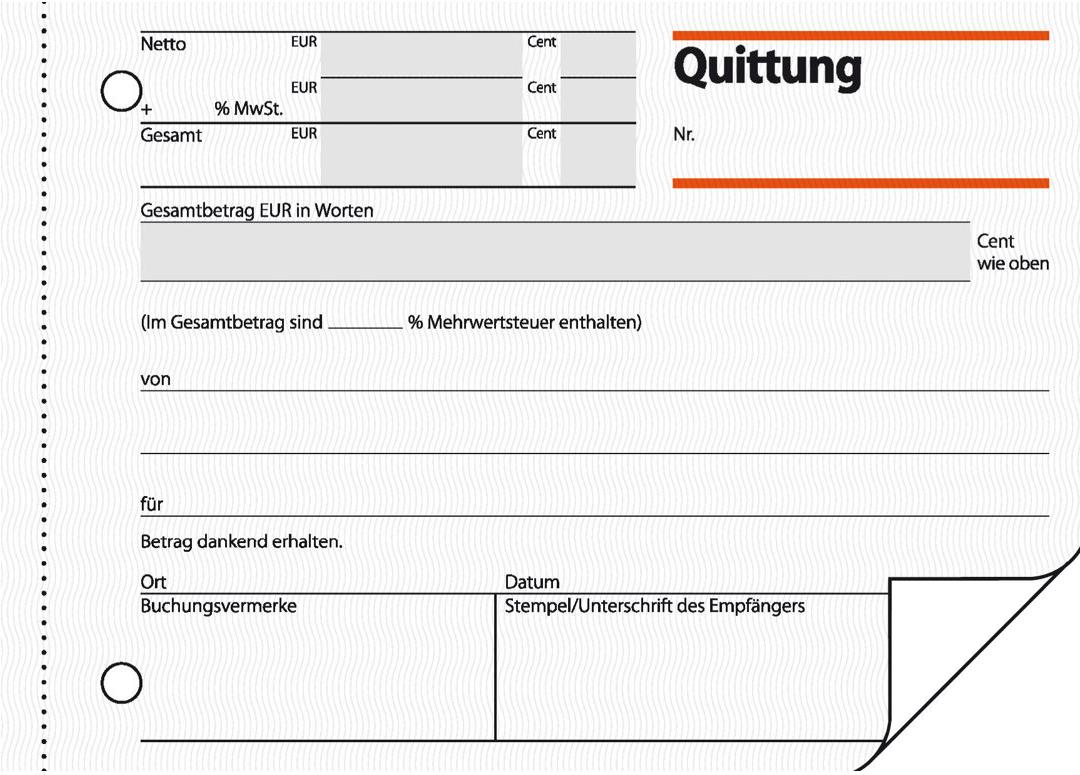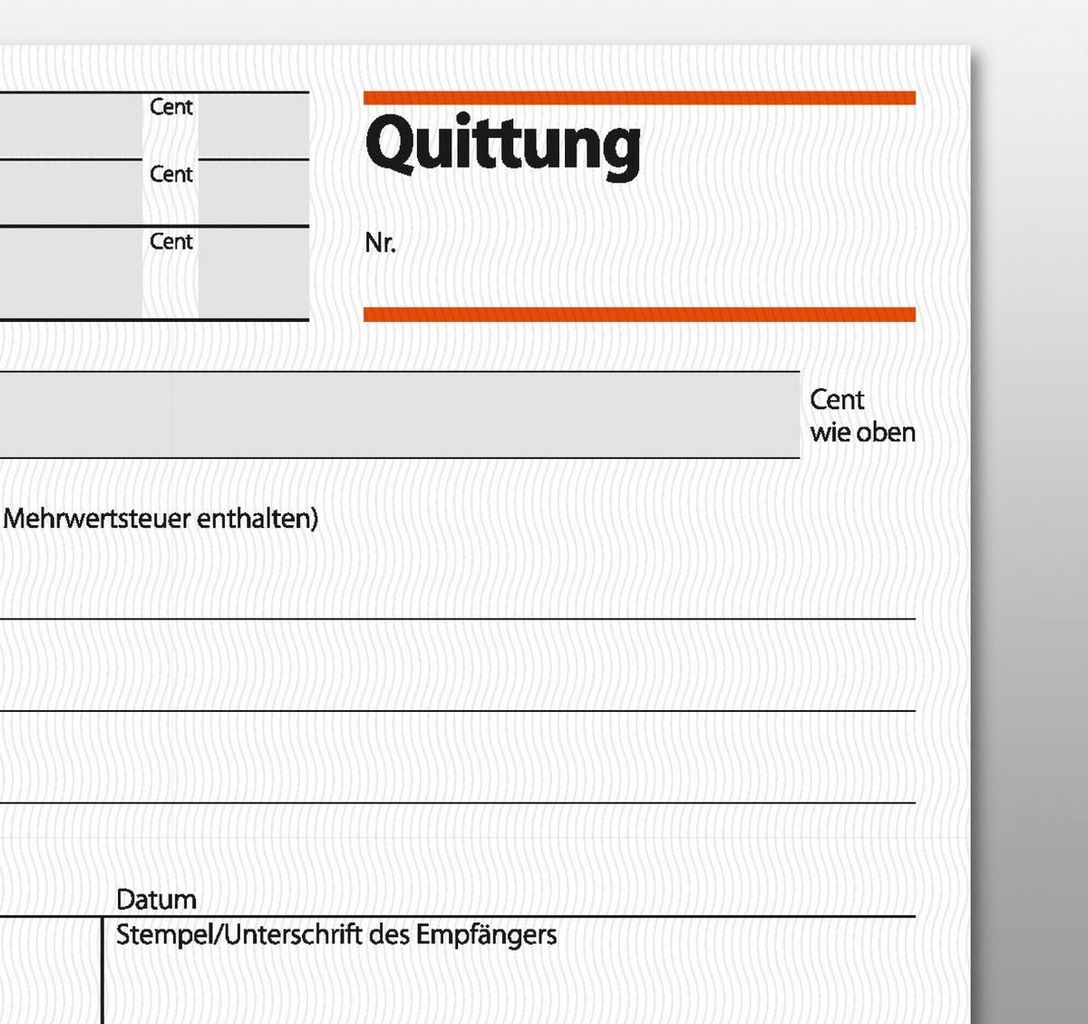 Quittungsbeleg mit MwSt.-Nachweis im Format DIN A6 quer mit 50 Originalen + 50 Kopien, inklusive Blaupapier. FSC zertifiziert, aktuell und rechtssicher, mit fälschungssicherem Dokumentendruck auf jedem Originalblatt. Das Original hat eine Abheftlochung und eine ultrafeine Microperforation für ein schnelles und sauberes Heraustrennen, die Kopie ist ohne Perforation und verbleibt im Buch. Eine Sicherheitsbindung macht das Formularbuch besonders stabil und haltbar.
