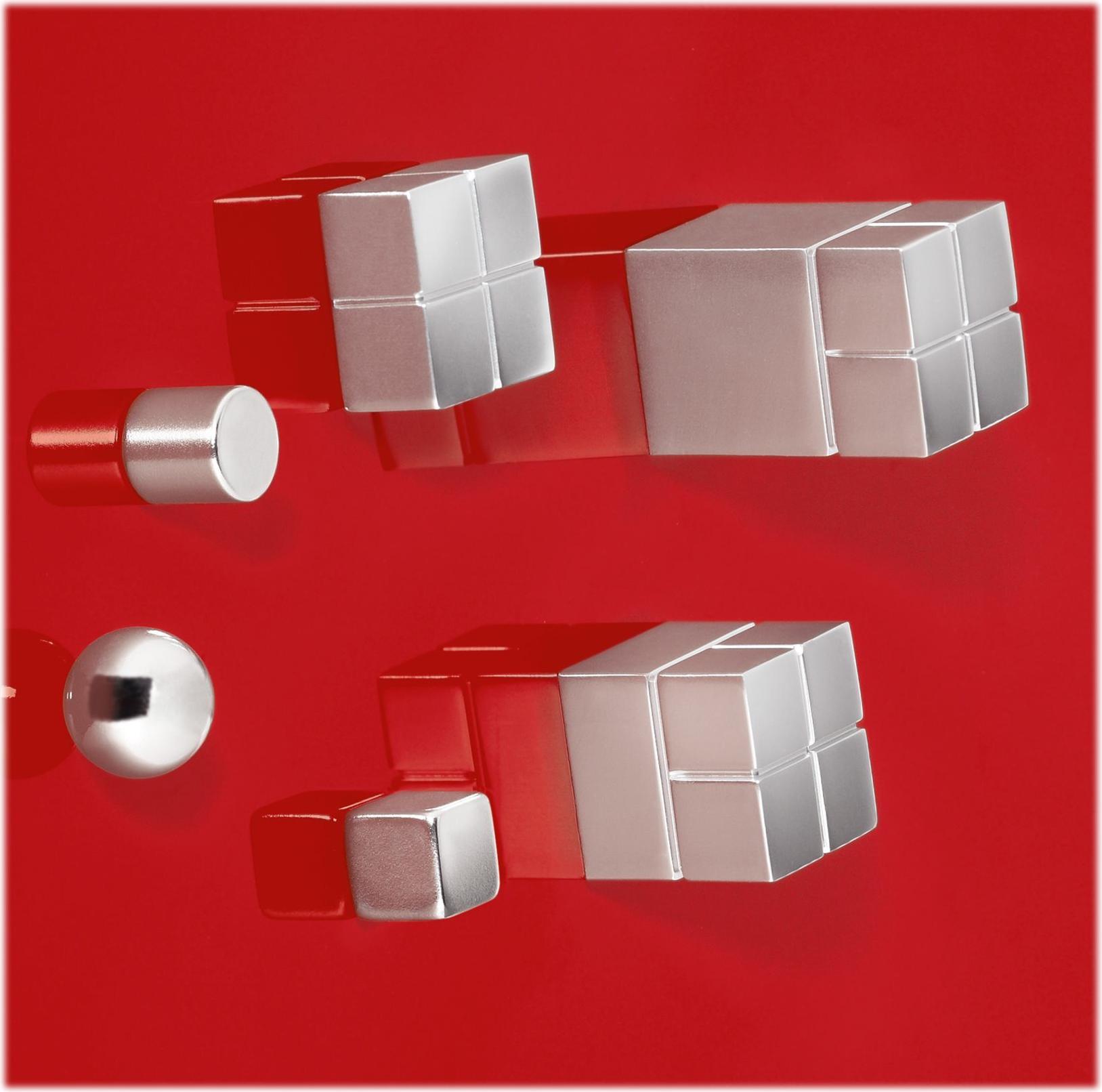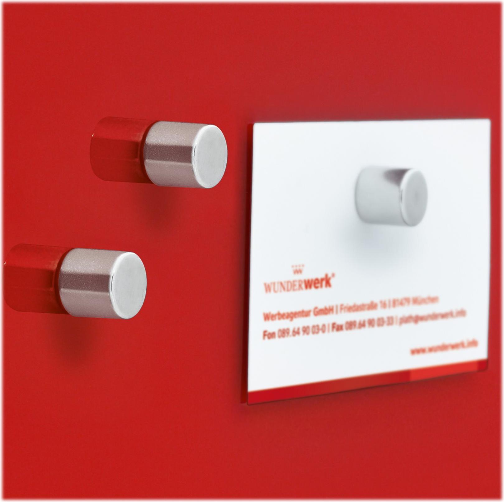 Die zehn starken SuperDym-Magnete C5 im Zylinder-Design (Ø10x10 mm) halten bis zu 8 Blätter DIN A4 Papier (80g/m ) auf den Glas-Magnetboards artverum . Das Material der hochglänzenden silbernen Magnete ist Neodym, vernickelt.