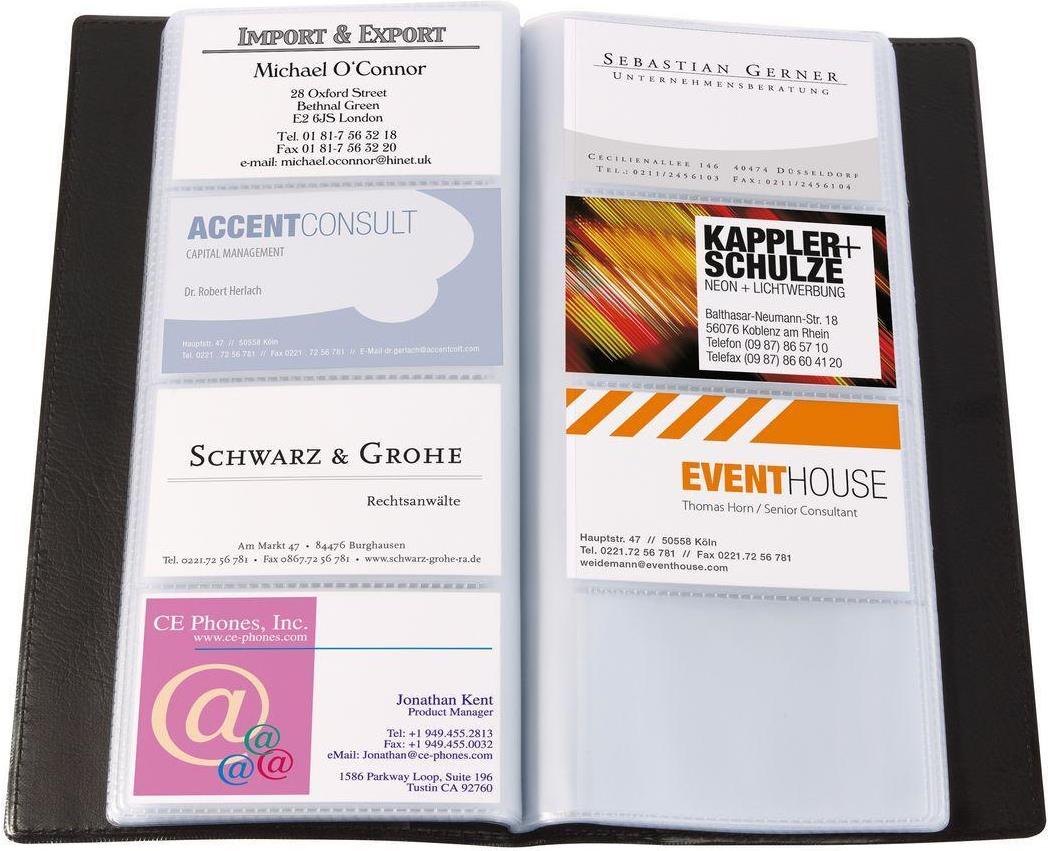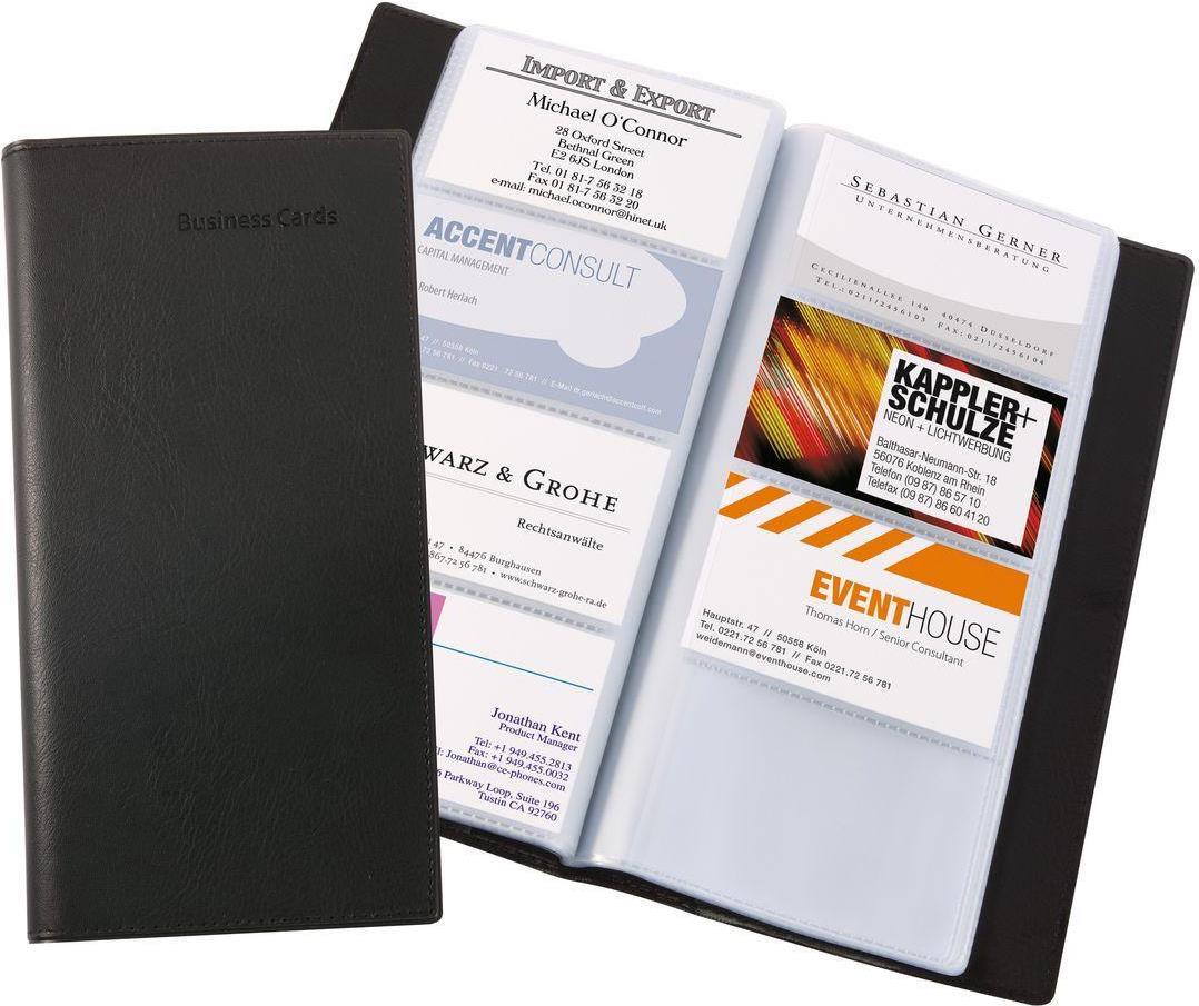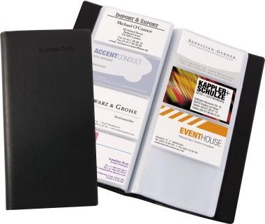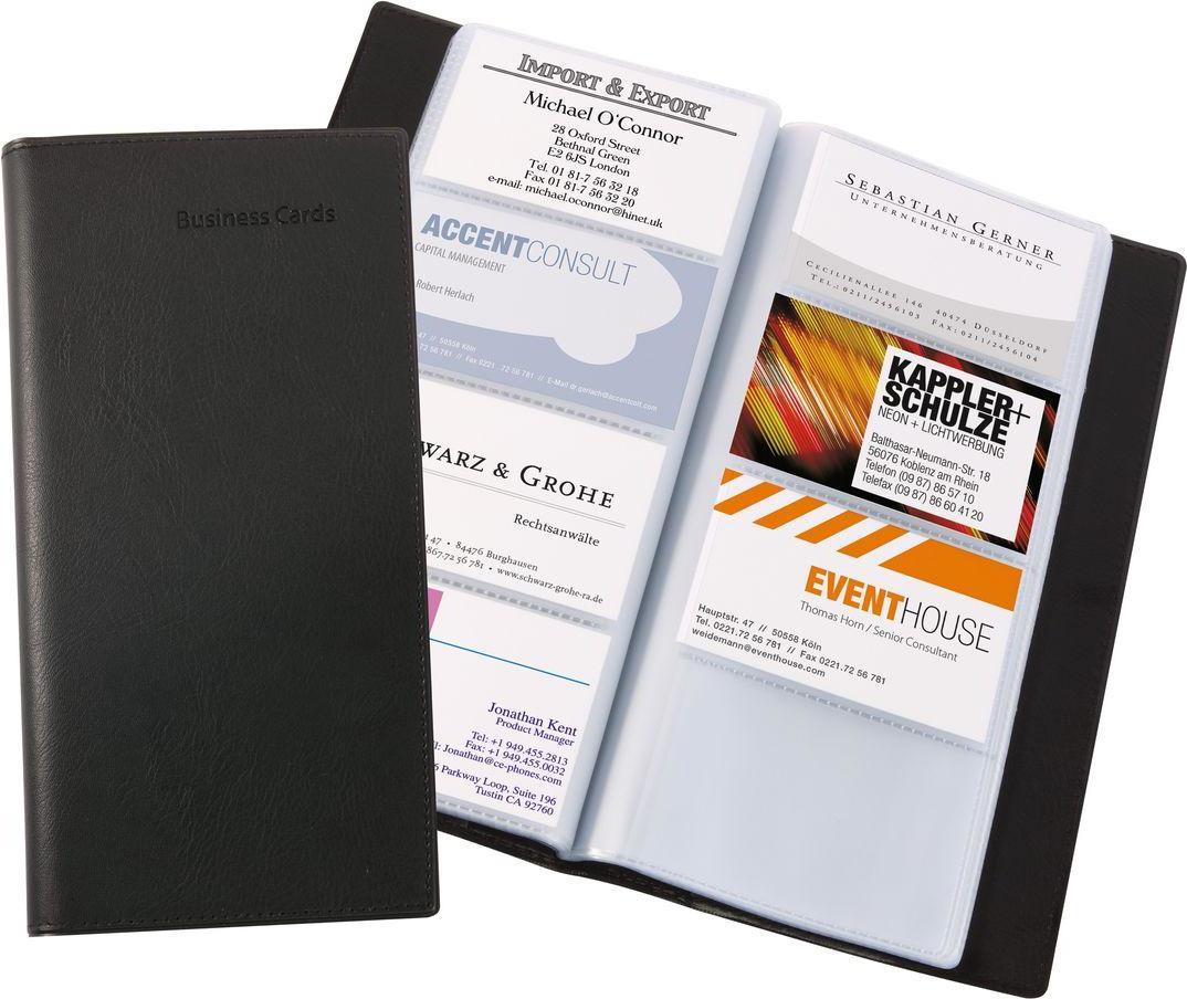 Visitenkarten-Mappe in matt-schwarzer Lederoptik zur übersichtlichen Aufbewahrung von Visitenkarten oder anderen Karten. Mit 24 transparenten Hüllen, die sowohl auf der Vorder- als auch der Rückseite befüllt werden ...