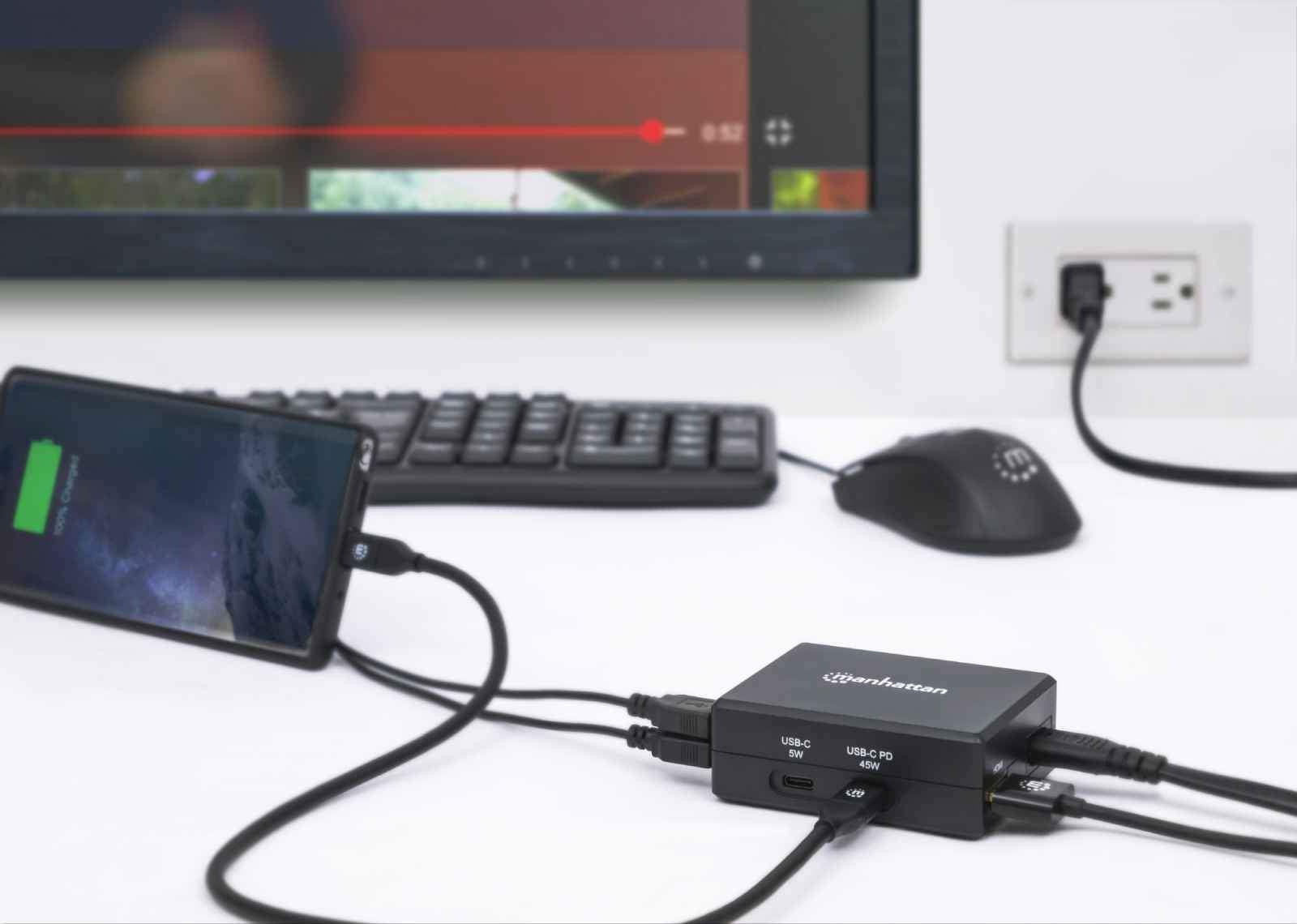 Der kompakte Manhattan Smart Video Power Delivery-Ladehub bietet drei essenzielle Funktionen, die Geschäftsreisenden und Smartphone-Power-Usern das Leben deutlich erleichtern: Displayanbindung, Peripherieanschluss und Lademöglichkeit für Ihre Geräte - ganz ohne schweres, sperriges Netzteil oder Power-Delivery-Ladegerät.