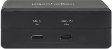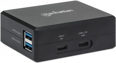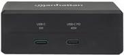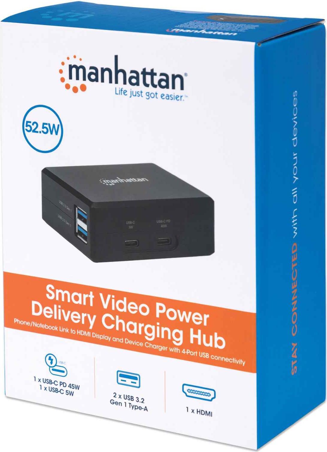 | Produktbeschreibung | Manhattan Smart Video Power Delivery Charging Hub, Multiport Dock with One HDMI Port, USB-C PD Port up to 45 W, USB-C up to 5 V/1 A, Two USB 3.2 Gen1 aka USB 3.0 Type-A Ports, Internal Power Supply, Ultra-Compact, Detachable Power Cable, Black (Euro 2-pin plug) - Videoschnittstellen-Converter - HDMI / USB |