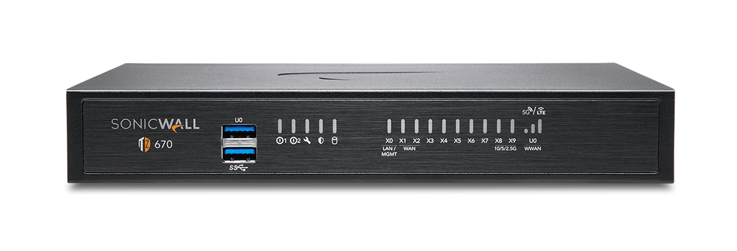 Die TZ670 Firewalls im Desktop-Firewall-Formfaktor bieten Multi-Gigabit (5/10G)-Schnittstellen für die Konnektivität mit SonicWall Switches oder anderen Netzwerkgeräten in SD-Branch-Implementierungen und eine starke Threat-Performance mit Geschwindigkeiten bis zu 2,5 GBit/s. Diese Next-Generation-Firewalls verfügen über integrierte sichere SD-WAN, Zero-Touch Deployment, TLS 1.3- und 5G-Unterstützung sowie weitere innovative Funktionen, die Kosten senken und Zeit sparen.