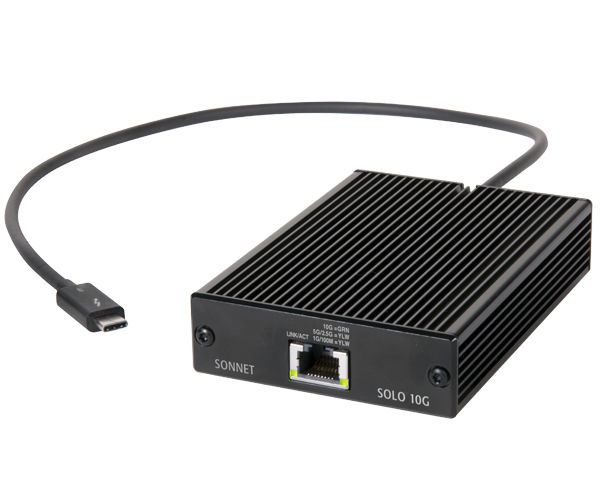 10 Gigabit Ethernet ist der Standard in der Post-Produktion für Shared-Storage-Arbeitsgruppen und 4K Arbeitsabläufe. Kostengünstige 10 Gigabit Ethernet Switche mit RJ45 Buchsen treiben den Wandel hin zu 10GbE Infrastrukturen. Der Sonnet Solo 10GTM Thunderbolt 3 Adapter ist eine leistungsstarke und gleichzeitig kostengünstige Lösung, um Ihren Thunderbolt 3TM Computer an ein 10GBase-T (10GbE) Netzwerk anzubinden. Der Adapter ist mit Thunderbolt 3 Mac und Windows (1) Computern kompatibel. Der Solo 10G Adapter verfügt über eine RJ45 Buchse. Mit dieser kann er an 10GbE Infrastrukturen über kostengünstige CAT 6 (55 m) und CAT 6A (100 m) Kupferkabel angeschlossen werden.