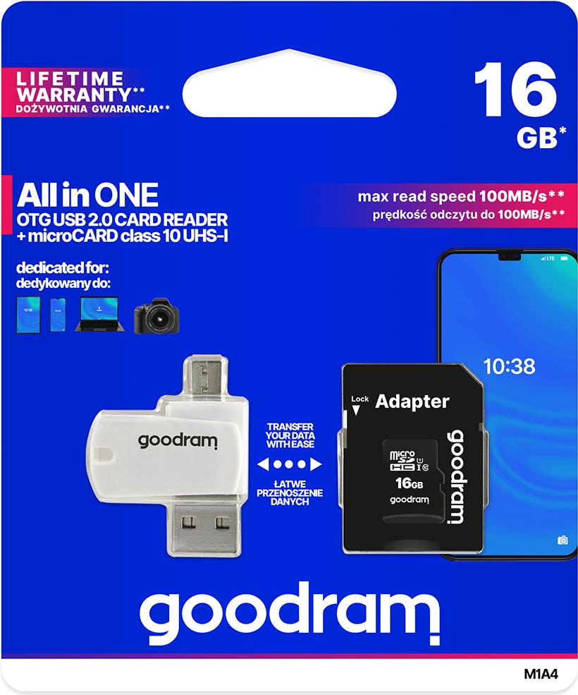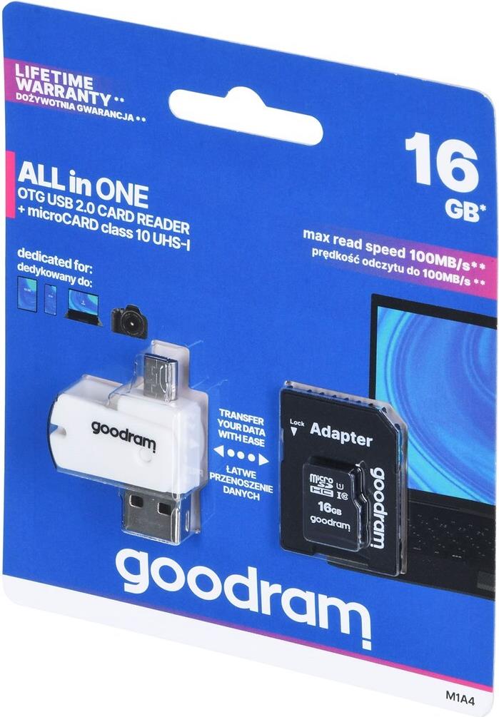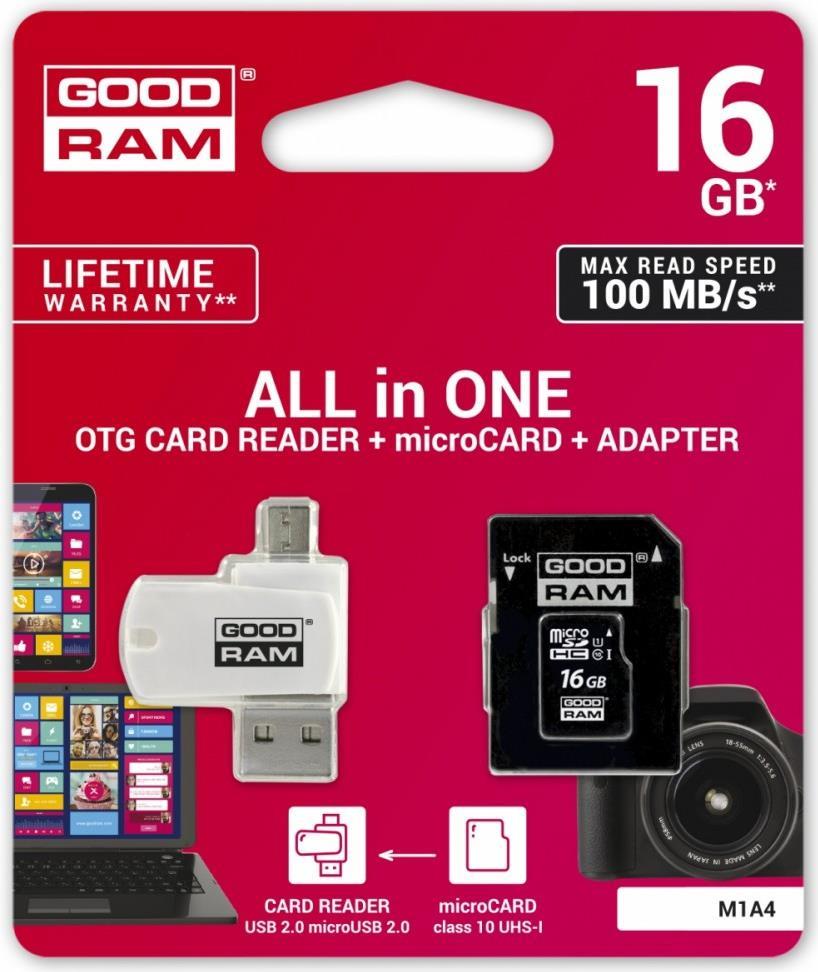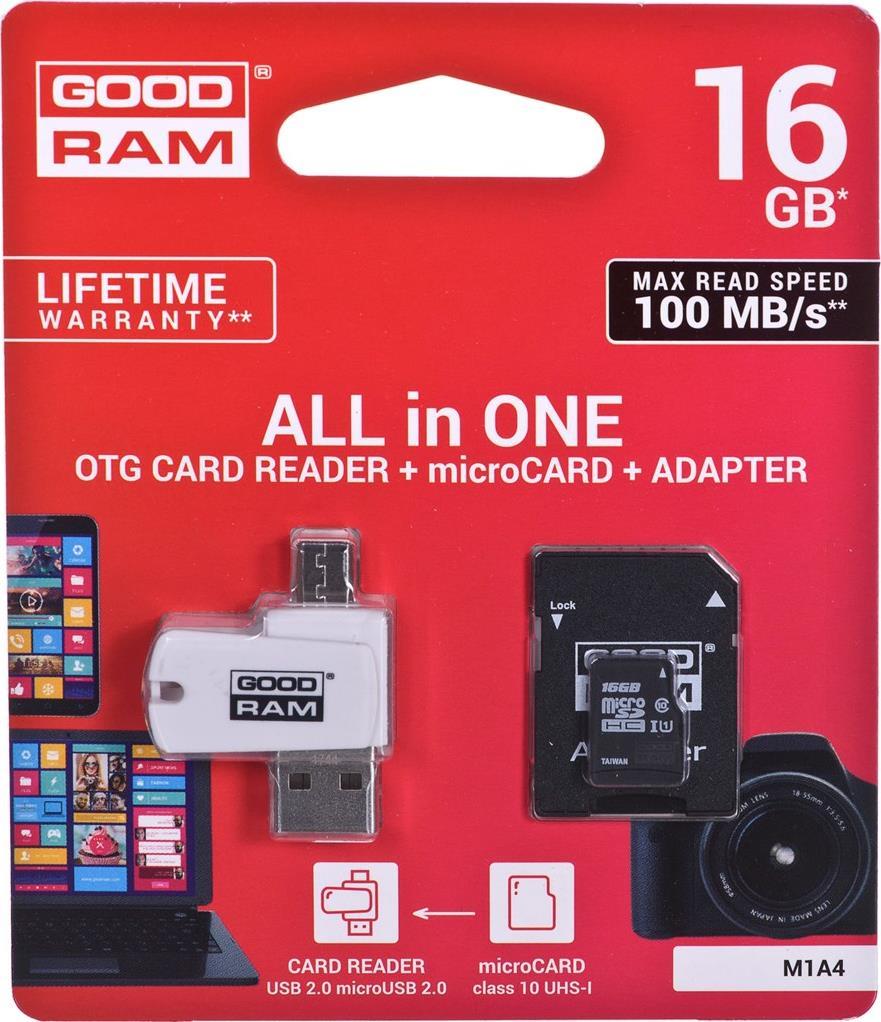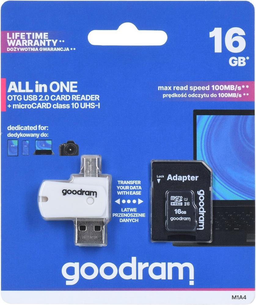 Speicherkarte mit Adapter und GoodRam All in One M1A4-0160R12 (16 GB; Klasse 10; Adapter, MicroSDHC-Kartenleser, Speicherkarte) (M1A4-0160R12)