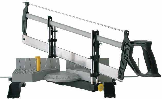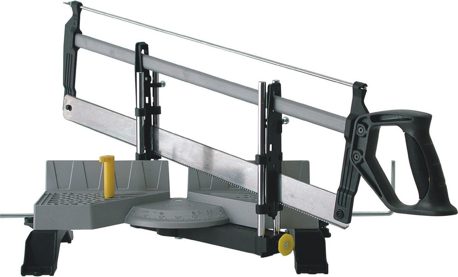 Gehrungslade Metall mit SägeDruckgegossene Basis, Speziell gehärtetes, austauschbares Sägeblatt mit extra feiner Universalverzahnung, Blatt-Spann-Schraube für einfaches Auswechseln der Klinge und zur Sicherung eines genauen Schnittes, Sägestände f