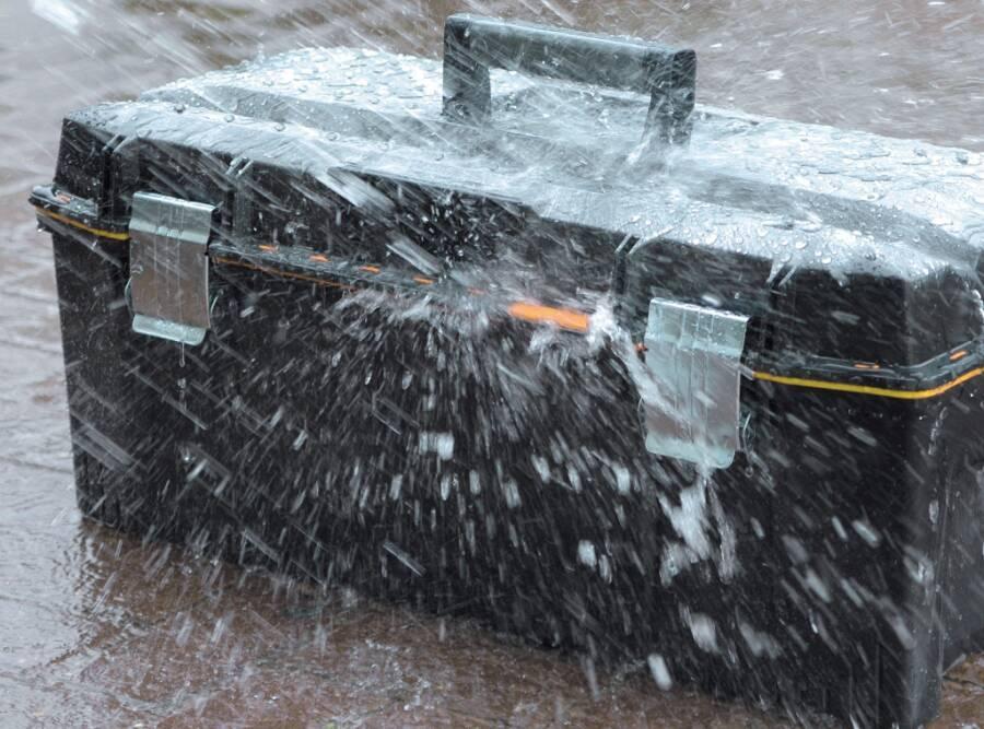 Professionelle Werkzeugbox, rundum abgedichtet. Mit Vertiefung im Deckel zum Einlegen und Bearbeiten von Werkstücken. Entnehmbare Trage, robuster großer Griff mit ...