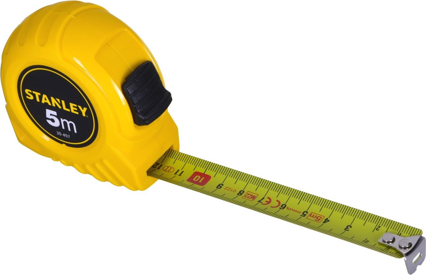 Bandmass Stanley 5m/19mmAusstattung: Extra-starkes Band (12,7 bis 25 mm), gebogenBand vollständig mit Polymer-Schutzschicht überzogenEndhaken dreifach ab 5 m, zweifach bis 3 m vernietet, verschiebbar für Innen- und AuSSenmessung