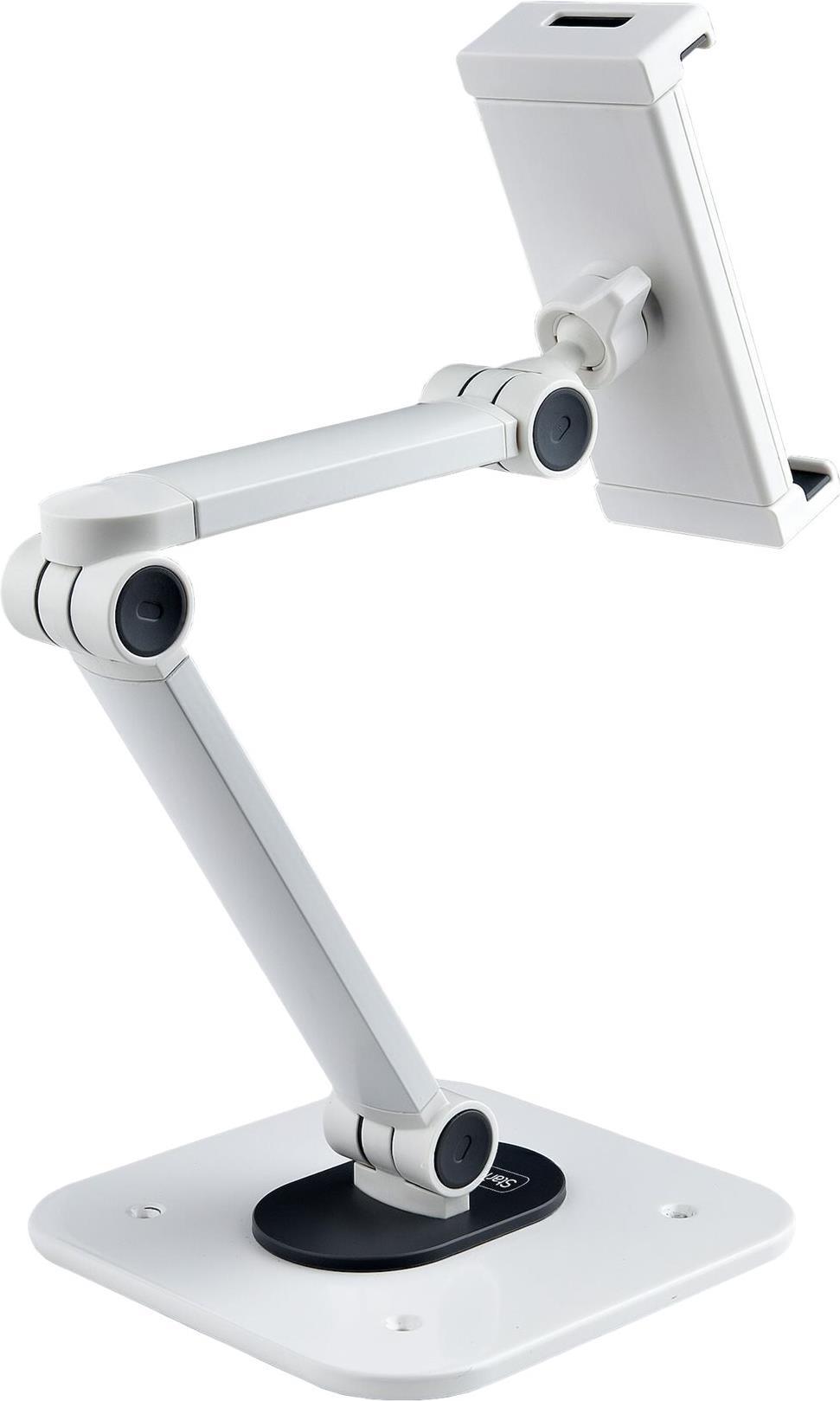 Mit diesem ergonomisch einstellbaren Tabletständer lässt sich ein Tablet nahtlos in einen Arbeitsbereich integrieren. Ändern Sie die Position des Tablets innerhalb der Klemme in einem Winkel, der den Bedürfnissen des Benutzers entspricht. Die Tablet Halterung hat rutschfeste oberfläche an der Klemme und an der Unterseite der Basis, um das Tablet und die Arbeitsfläche zu schützen. Befestigen Sie die Basis mit den enthaltenen 4,2x19 mm Holzschrauben auf einem Schreibtisch. Die Klemme unterstützt Tablets, die eine Breite von 12,8 bis 22,4 cm (5 bis 8,8 Zoll), eine Dicke von 1 cm und ein maximales Gewicht von 1 kg haben. Der Tablethalter wird komplett montiert geliefert, damit er schnell in Umgebungen mit Kundenkontakt und Point-of-Sale Anwendungen eingesetzt werden kann.