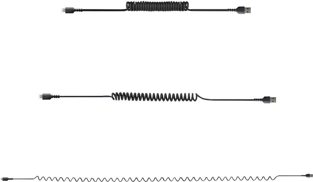 Dieses Spiralkabel von Lightning auf USB-A hält den täglichen Anforderungen des Ladens und Synchronisierens Ihrer mobilen Geräte stand.Es lässt sich auf 38 cm zusammenziehen und ist somit kompakt und bequem zu verstauen.Produkttext[/head]USB-A zu Lightning Kabel 1m, MFi zertifiziert, SpiralkabelDieses Spiralkabel von Lightning auf USB-A hält den täglichen Anforderungen des Ladens und Synchronisierens Ihrer mobilen Geräte stand.Es lässt sich auf 36 cm zusammenziehen und ist somit kompakt und bequem zu verstauen.Gebaut für den täglichen GebrauchDas robuste Lightning Ladekabel hat eine Verstärkung aus Aramidfasern, die es vor der Belastung durch häufiges Biegen schützt. Dadurch lässt sich das Kabel auch biegen, ohne dass es überdehnt oder der Kern des Kabels beschädigt wird.Flexible ZugentlastungDas Lightning auf USB-A Kabel ist so konstruiert, dass sich der Stecker nicht vom Mantel lösen kann. Die extralange Zugentlastung wurde getestet, um mehr als 5.000 Biegezyklen bei einem Winkel von 180° zu widerstehen.Hochwertige VerbindungDas robuste Kabel unterstützt alle USB 2.0 Spezifikationen und bietet eine zuverlässige Verbindung für alle Ihre Lightning Geräte. Es ist außerdem Apple MFi-zertifiziert, was ein schnelles und zuverlässiges Laden und Synchronisieren von USB-A Ladeanschlusse garantiert.RUSB2ALT1MBC wird durch eine StarTech.com® 2-Jahres Garantie und kostenlosen lebenslangen technischen Support unterstützt.The StarTech.com Advantage[head]Hauptmerkmale