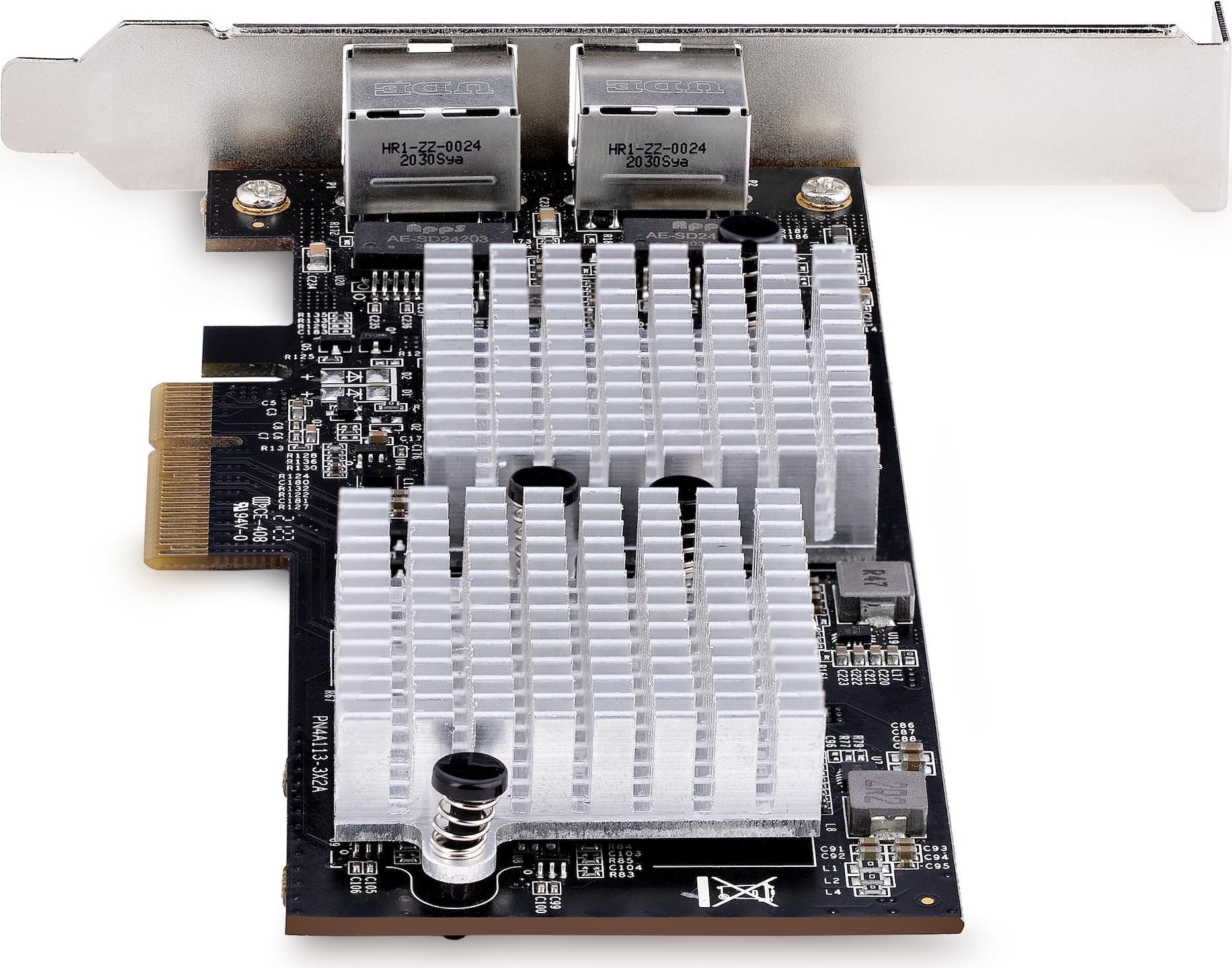 Diese PCIe-Netzwerkkarte schafft Zugang zu zwei Ethernet Anschlüssen mit hohen Bandbreiten. Dadurch verringert sie die Beeinträchtigung des Netzwerks bei der Ausführung datenintensiver Anwendungen/Prozesse wie FTP, Online-Speicher/Backup und Streaming von Online-Inhalten. Die Ethernet Netzwerkkarte unterstützt 10GBASE-T unter Verwendung einer bestehenden Cat6 (oder besser) Kabel Infrastruktur.