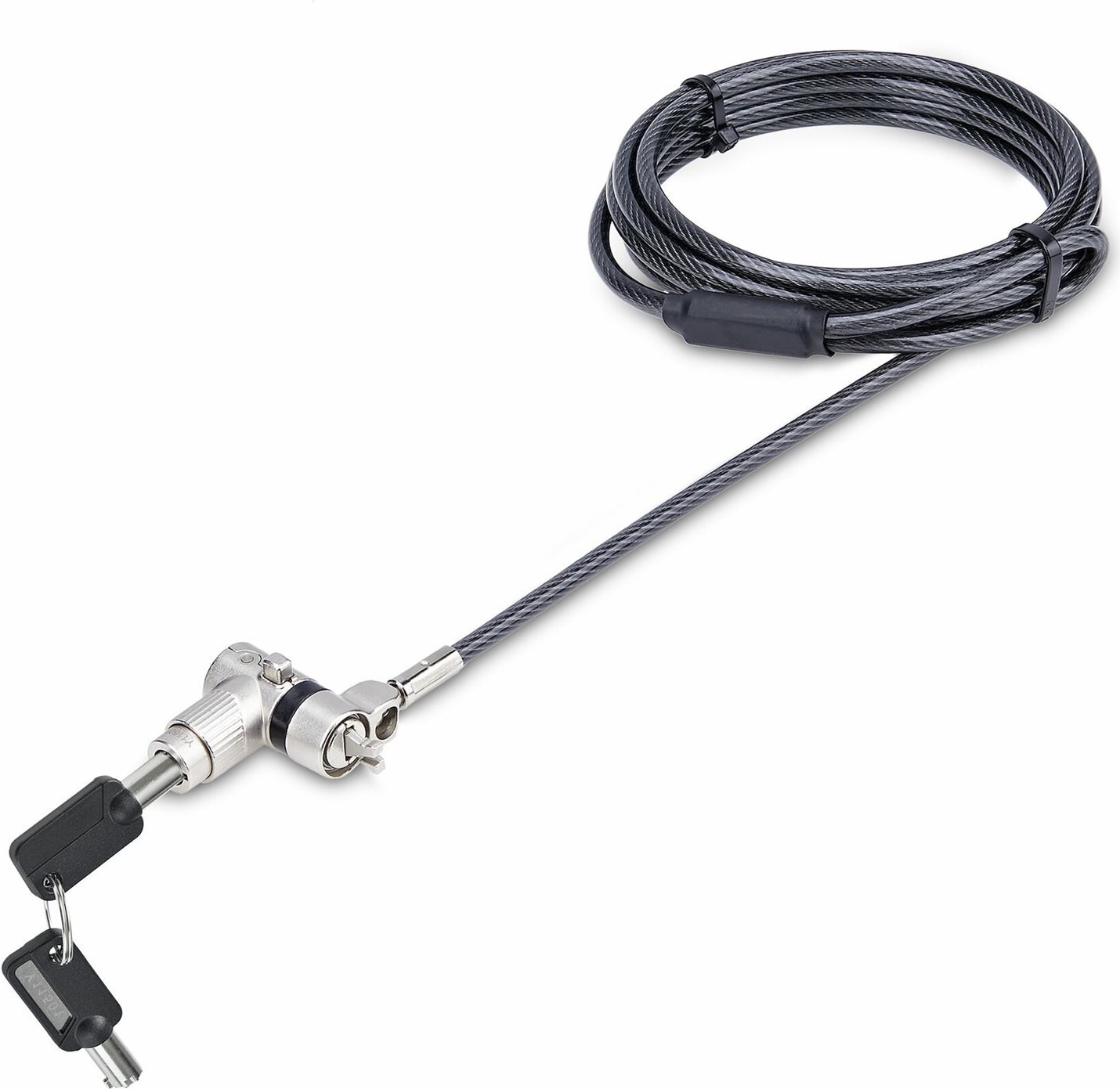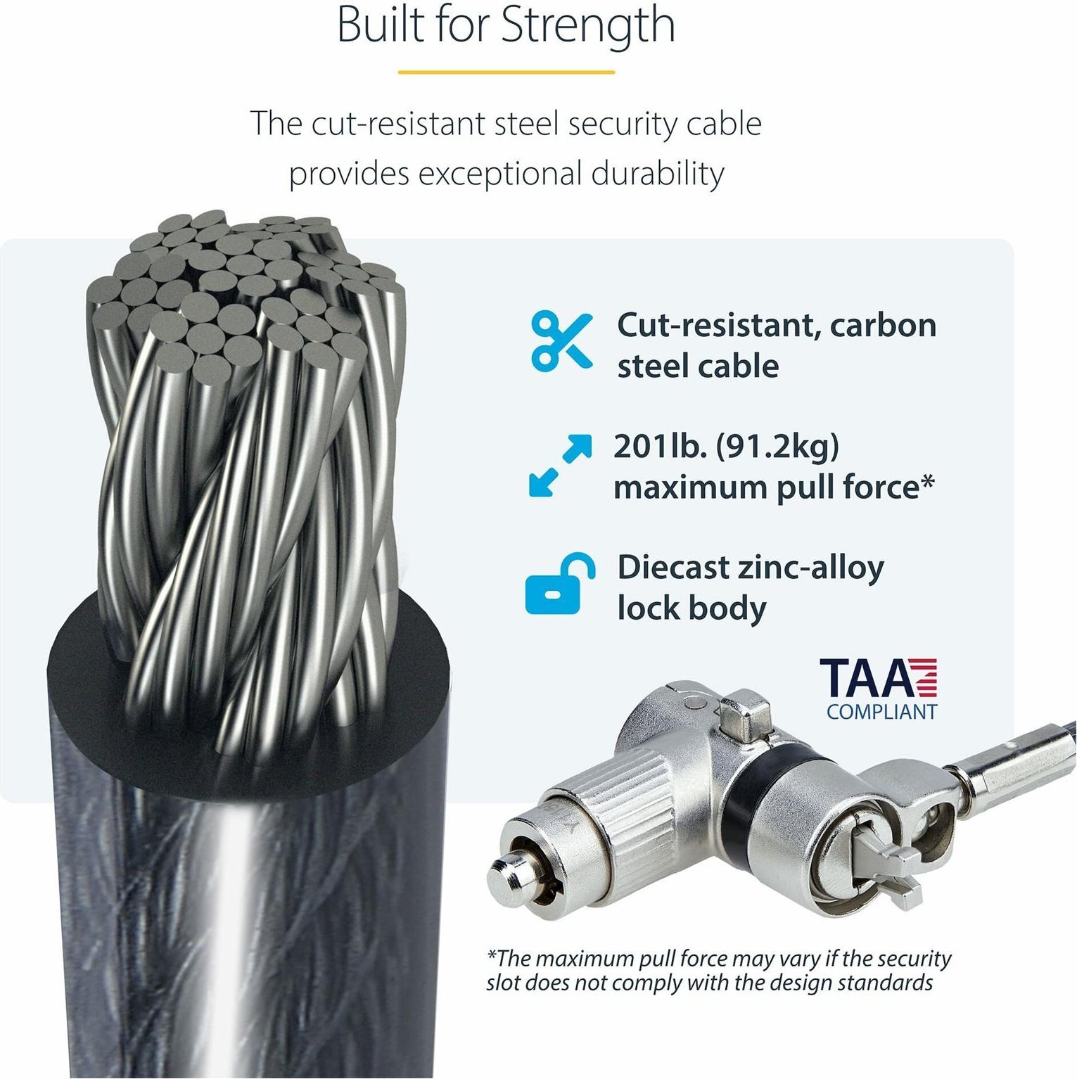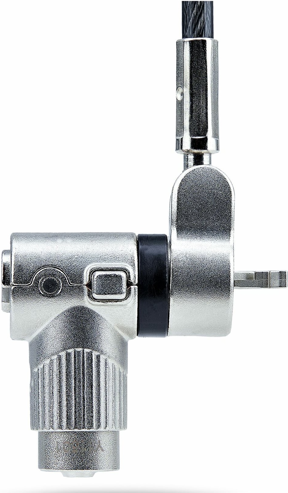 Ein einzigartiger Mechanismus ermöglicht eine schnelle Anpassung der Schlossspitze an verschiedene Sicherheitsschlitze. Drehen Sie einfach das Schlossauswahlrad, um die Form der Schlossspitze an den Sicherheitsschlitz anzupassen, ohne zusätzliches Werkzeug zu benötigen oder separate Schlossspitzen mitzuführen. Das schnittfeste Sicherheitskabel aus Stahl ist 2m (6,6 Fuß) lang und bietet Reichweite und Haltbarkeit.