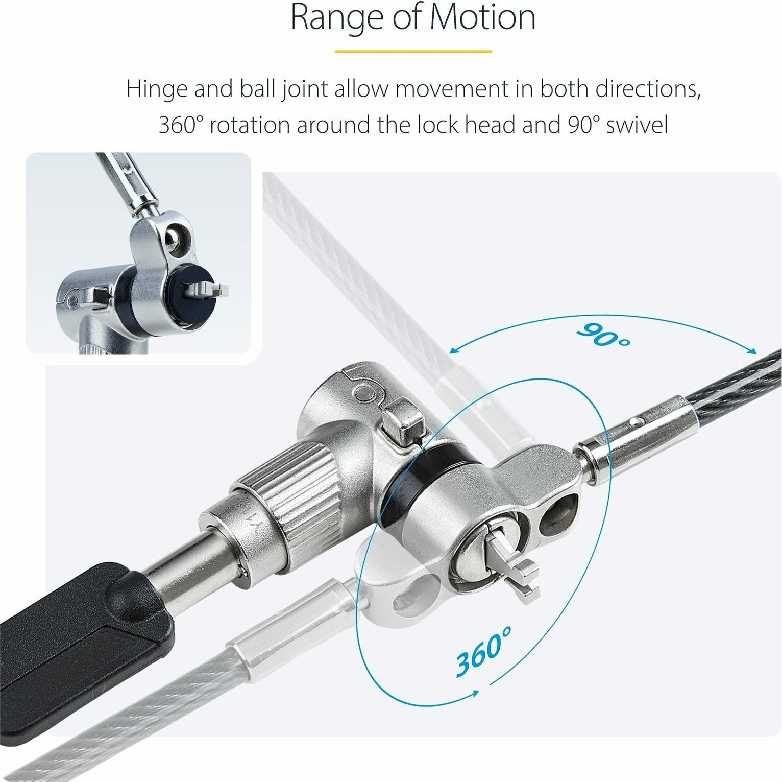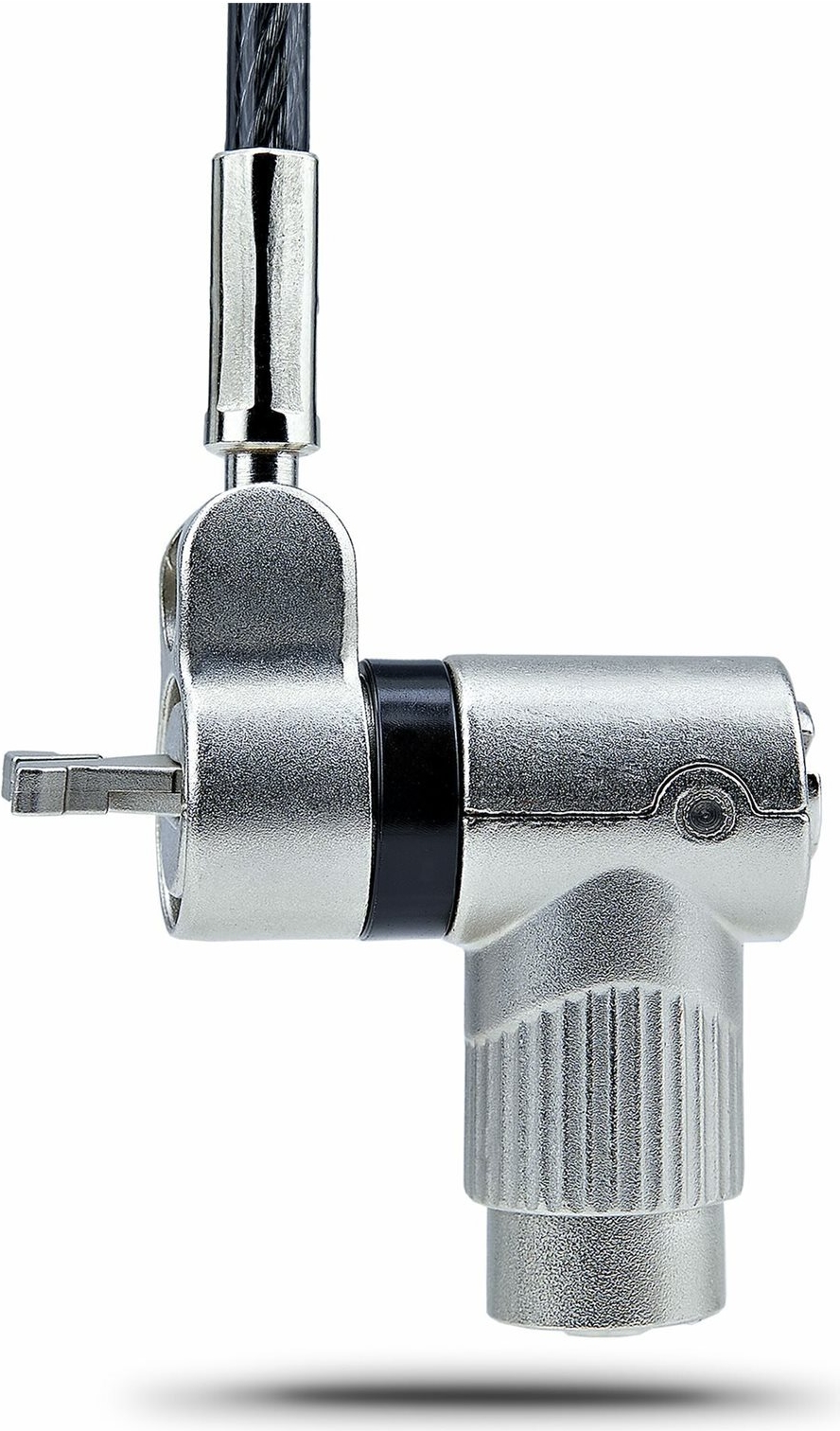 Ein einzigartiger Mechanismus zur schnellen Anpassung der Schlossspitze an verschiedene Sicherheitsschlitze. Drehen Sie einfach das Auswahlrad für das Schloss, um die Form der Schlossspitze an den jeweiligen Sicherheitsschlitz anzupassen, ohne dass Sie verschiedene Schlossspitzen mit sich führen oder Spezialwerkzeuge verwenden müssen. Das schnittfeste Sicherheitskabel aus Stahl ist 2m lang und 4,4mm dünn und bietet Reichweite und Haltbarkeit.