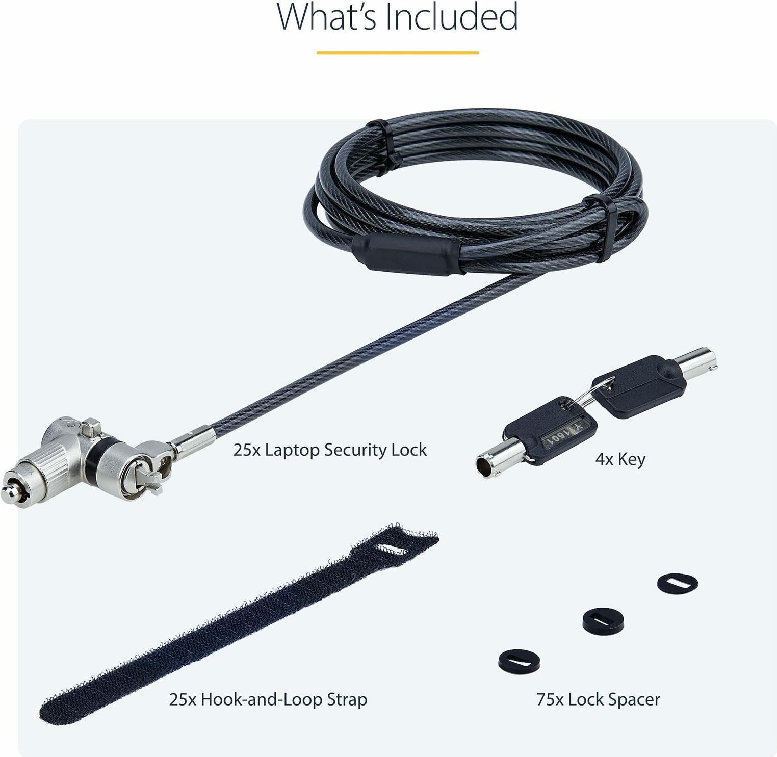 Das 25er-Pack Universal Laptop Lock ist eine vielseitige Lösung, die mit Noble Wedge ; K-Slot (T-Bar) oder Nano kompatibel ist und Flexibilität und Komfort bietet.