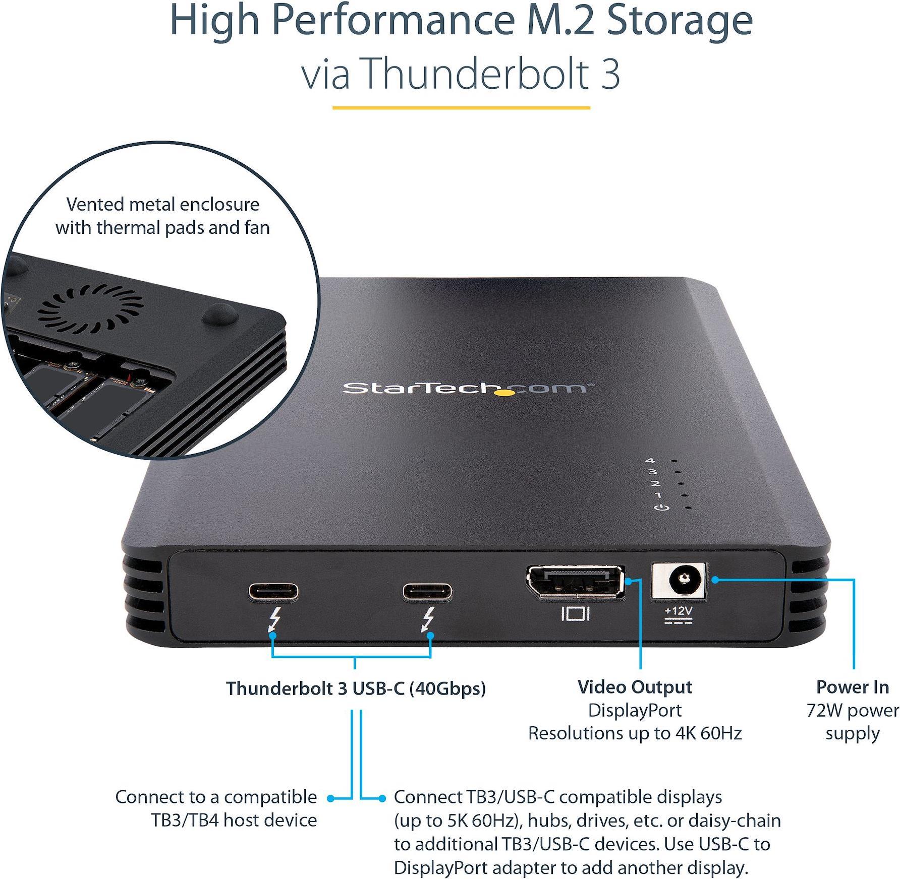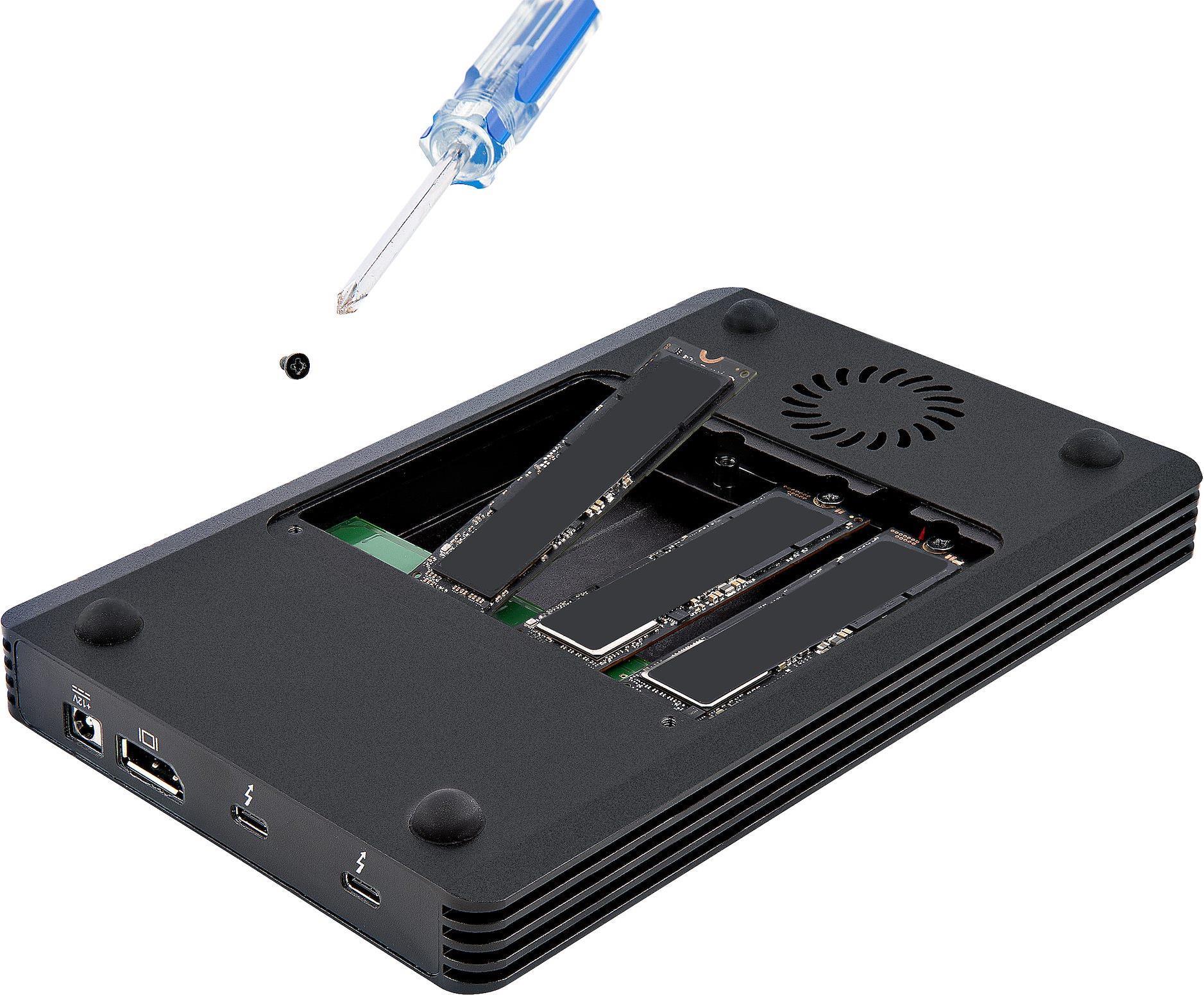 Das Gehäuse ist kompatibel mit 80 mm M.2 PCIe basierten (M-Key) SSDs mit einer oder zwei Seiten. Erstellen Sie eine externe Speicherlösung, die die hohe Leistungsfähigkeit Ihres Thunderbolt 3 Ports nutzt und kombinierte Datenübertragungsgeschwindigkeiten von bis zu 40 Gbit/s für bis zu vier Laufwerke bietet. Das perforierte Gehäuse ist mit Wärmeleitpads und einem Lüfter ausgestattet, um sicherzustellen, dass Ihre SSDs bei optimalen Temperaturen betrieben werden.