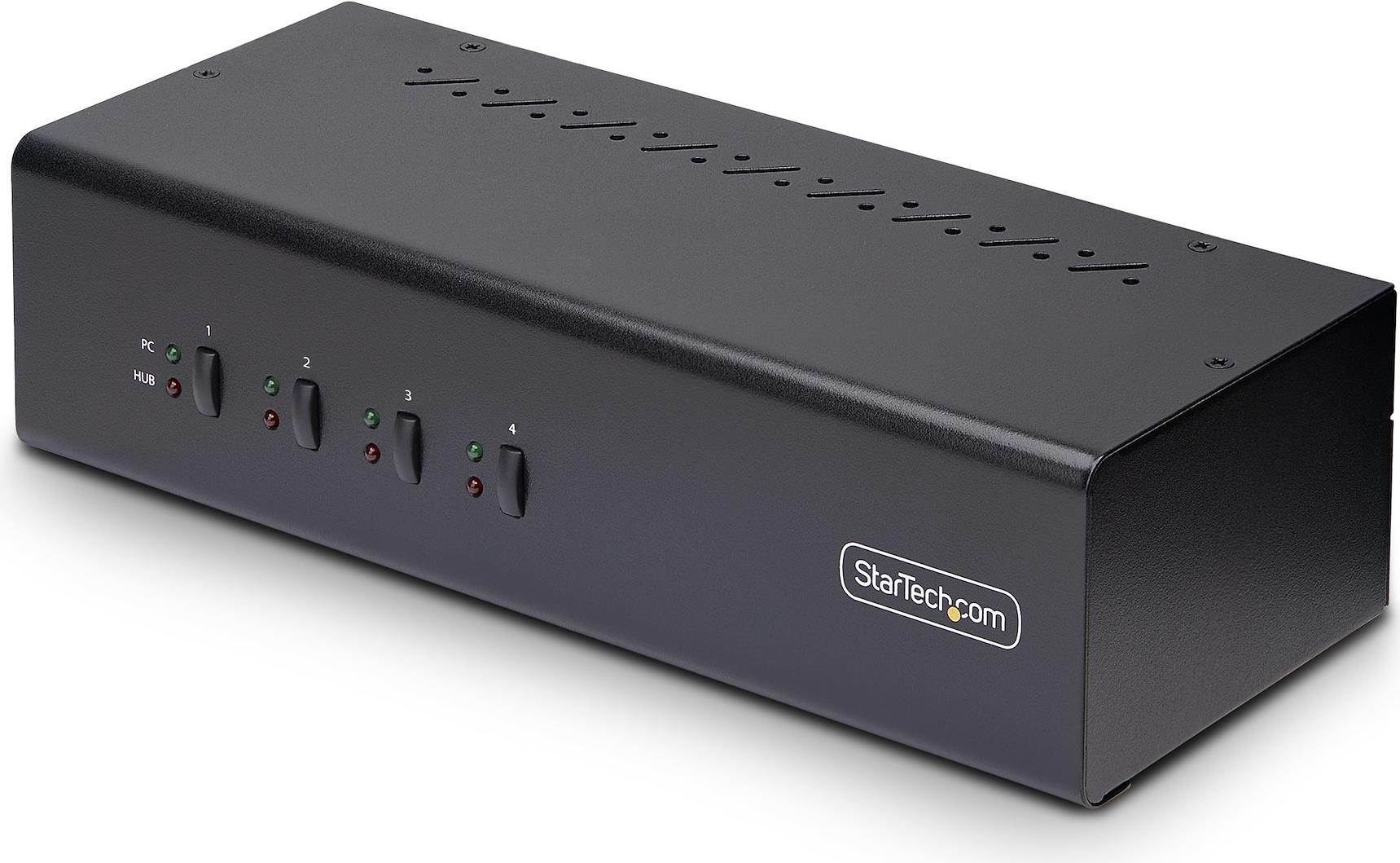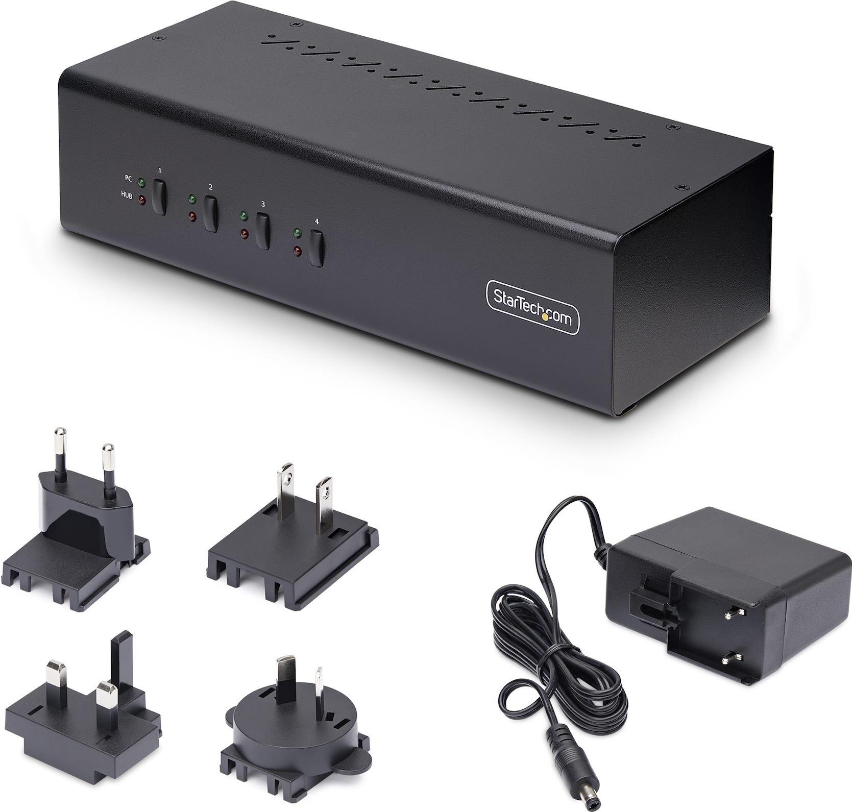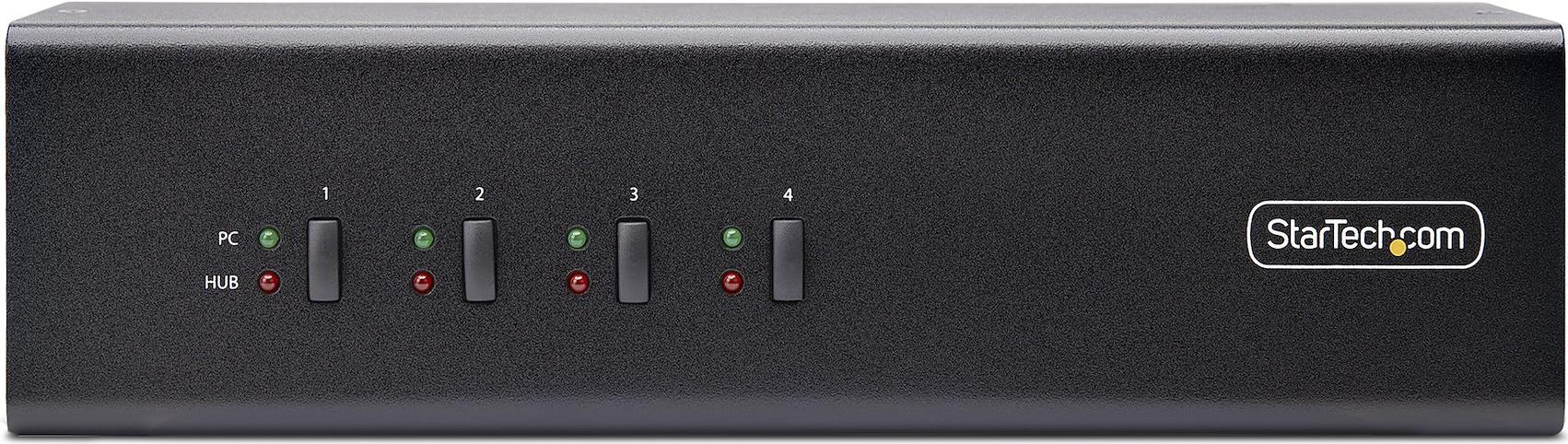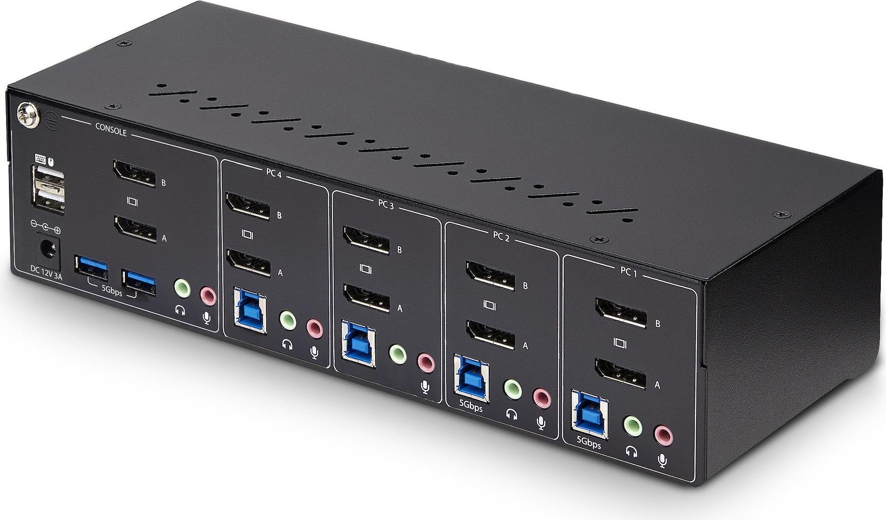 Mit diesem Dual-Monitor KVM-Switch können Sie zwischen vier Computer mit USB-A und DisplayPort-Anschluss umschalten. Er ermöglicht die gemeinsame Nutzung von zwei 4K 60Hz DisplayPort-Monitoren, einer Tastatur und Maus sowie zwei USB 5Gbps Geräten.