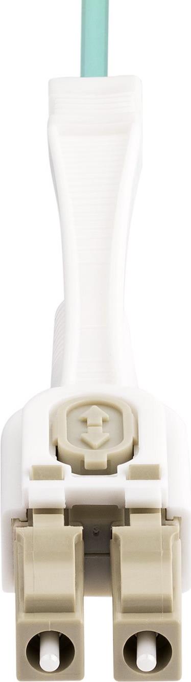 LC/UPC zu LC/UPC OM4 Multimode-Glasfaserkabel ermöglicht 40/100Gbps Netzwerkverbindungen. Die Push-Pull-Laschen an jedem Stecker sorgen für ein schnelles Anschließen und Entfernen und erleichtern die präzise Installation in Umgebungen mit hoher Anschlussdichte. Die knickunempfindliche Faser und die geformten Zugentlastungen unterstützen Kabelverläufe, die Mikro-/Makro-Biegungen erfordern, und sorgen gleichzeitig für eine geringe Dämpfung. Die ausziehbaren Zugentlastungsgehäuse ermöglichen einen werkzeuglosen Polaritätstausch. Farbcodierte LC-Duplex-Stecker sorgen für eine fehlerfreie Polaritätskonfiguration.