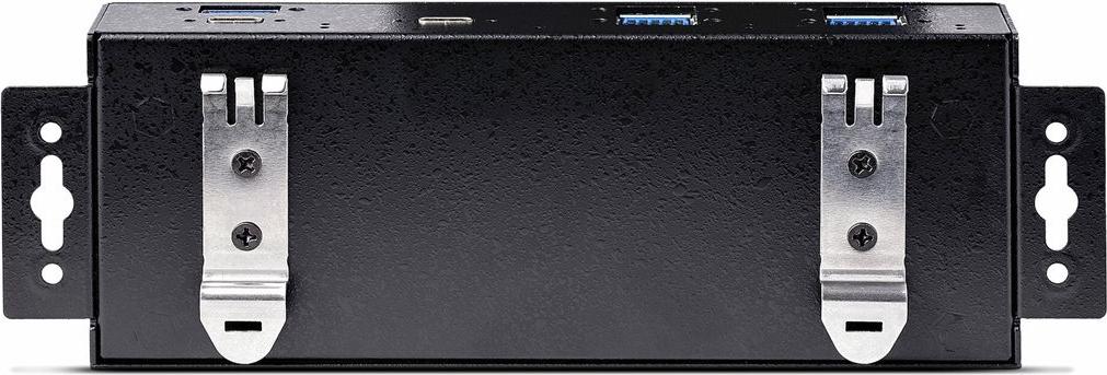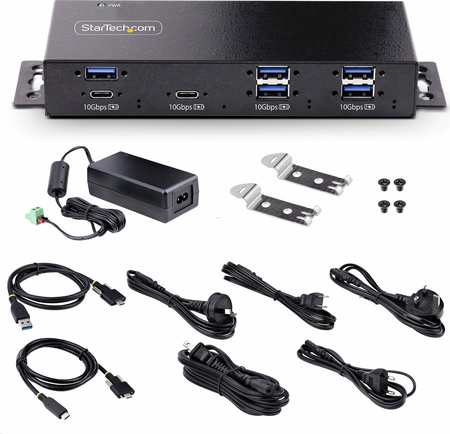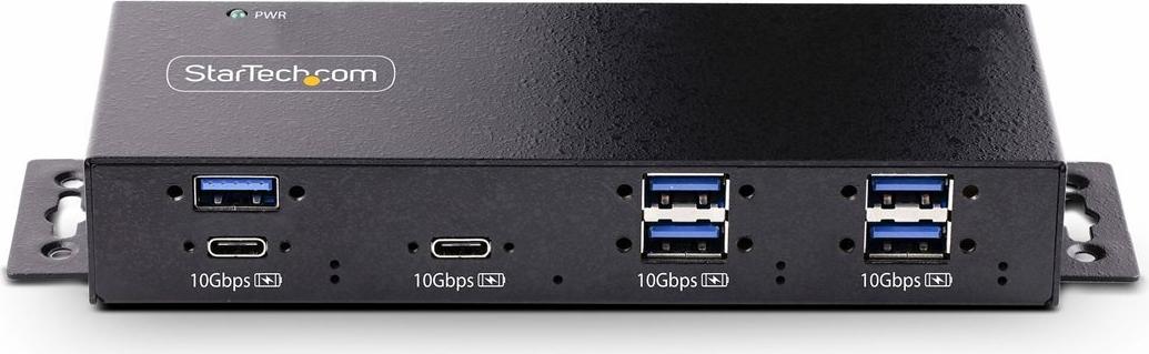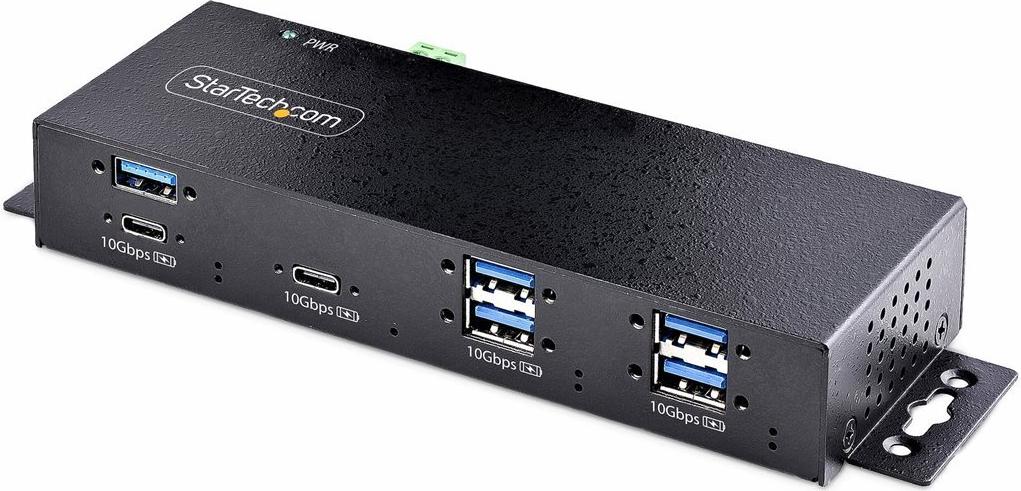 Der 7-Port industrielle USB 10Gbps Hub mit Netzteil verfügt über 5x USB-A und 2x USB-C Geräteanschlüsse. Er ist mit einem robusten Ganzmetallgehäuse ausgestattet, das rauen und industriellen Umgebungen standhält und gleichzeitig einen Schutz vor elektrostatischer Entladung (ESD) der Stufe 4 (15kV Luft / 8kV Kontakt) bietet, um angeschlossene Geräte zu schützen. Für sichere Verbindungen enthält dieser Hub zwei 1 m lange USB-Kabel (USB-C auf C und USB-C auf A) mit seitlicher Schraubverriegelung, um ein versehentliches Trennen zu verhindern. Der Hub kann auf oder unter einem Schreibtisch, an der Wand oder auf einer DIN-Schiene montiert werden, um eine sichere und platzsparende Installation zu gewährleisten.