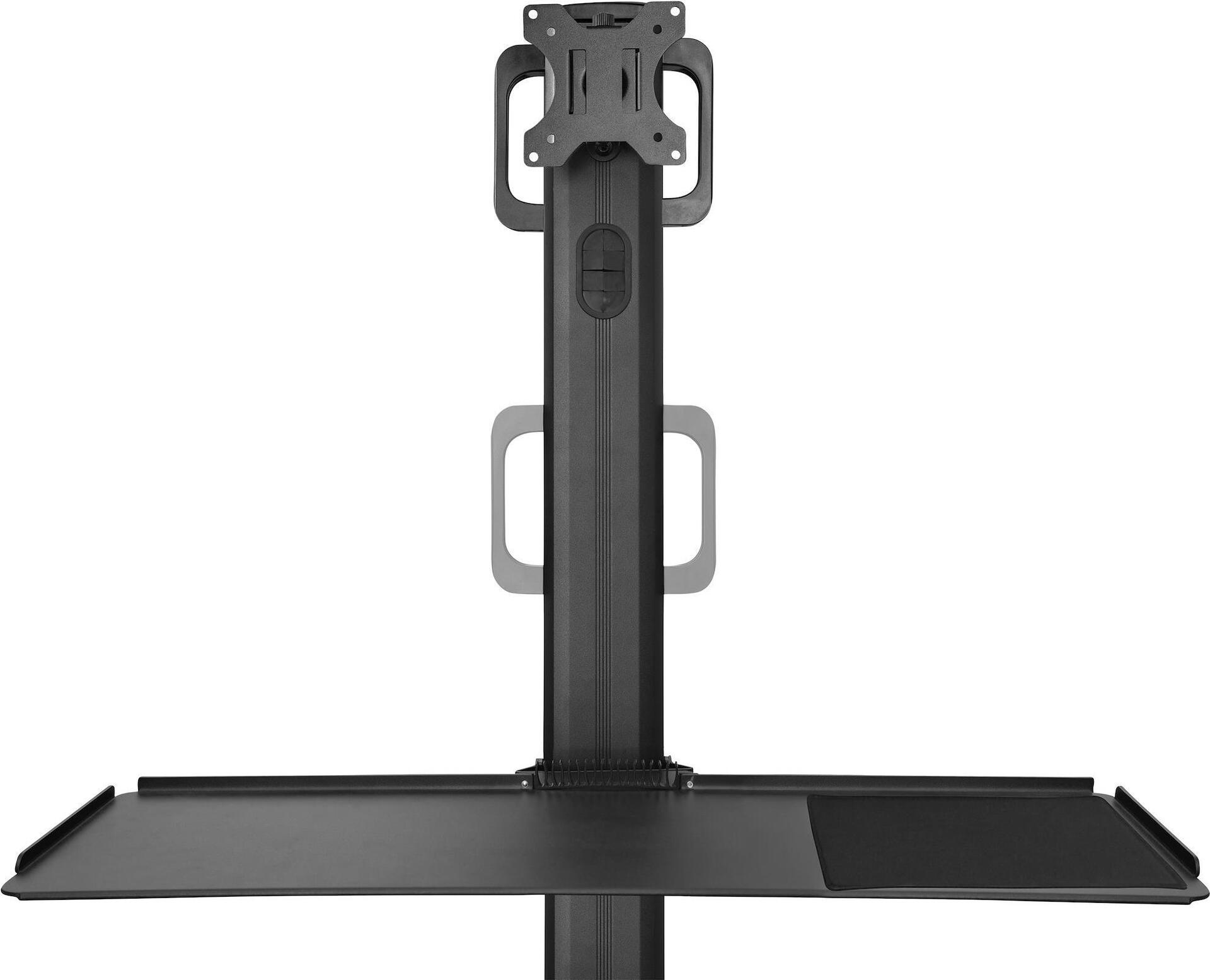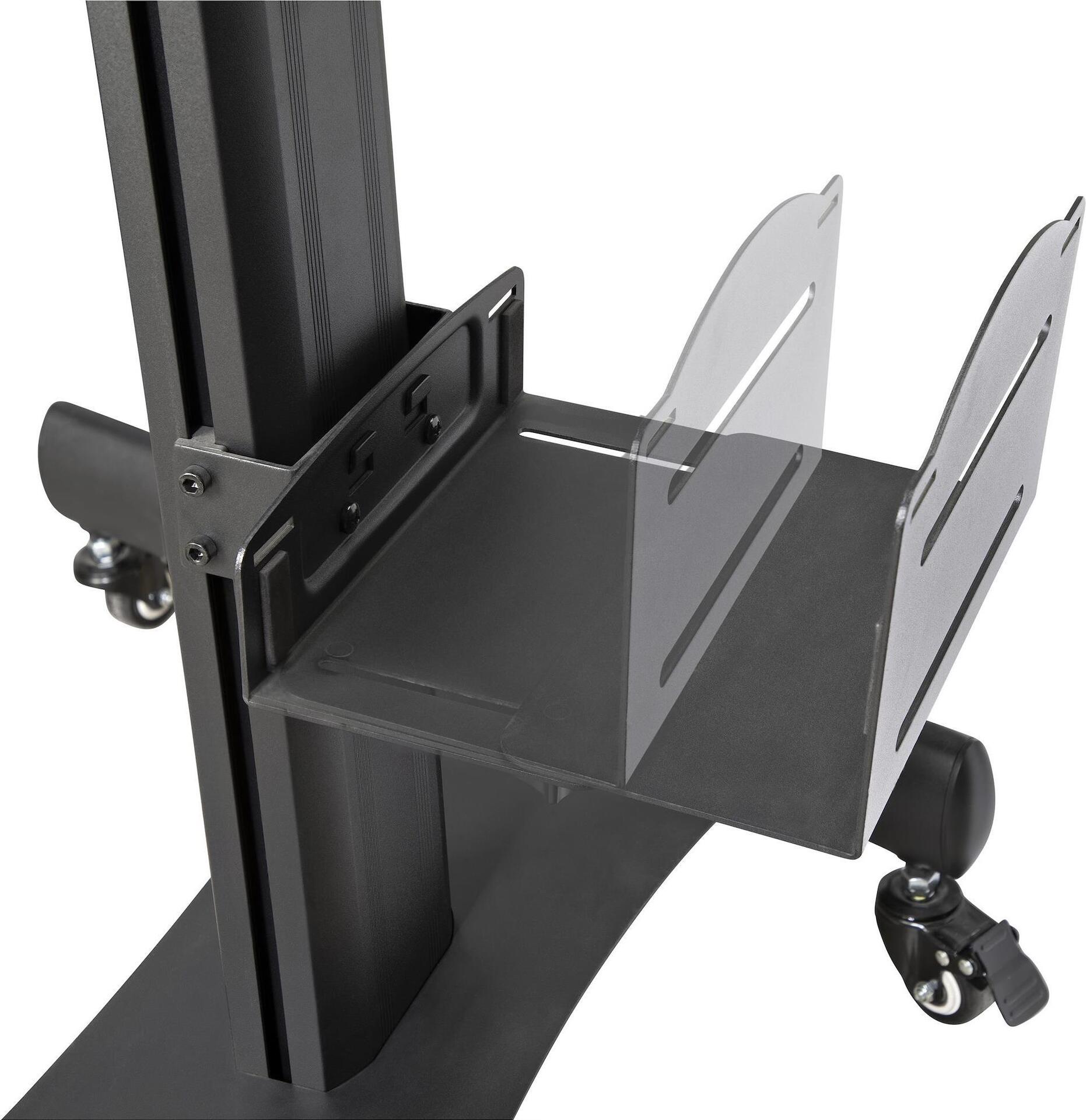 Dieser ergonomische mobile Arbeitsplatzwagen bietet Benutzern eine voll funktionsfähige, eigenständige Einrichtung. Er unterstützt einen einzelnen Monitor, verfügt über eine ausziehbare Tastatur- und Mausablage und ist mit einem integrierten CPU-Halter für Ihren PC-Tower ausgestattet. Die Rollen können leicht verriegelt werden, um zu verhindern, dass sich der mobile Arbeitsplatz bewegt, und um den Benutzern die Möglichkeit zu geben, bei Bedarf von mobil auf stationär zu wechseln. Der Gerätewagen für Desktop-Computer verfügt außerdem über ein Kabelführungssystem, das Ihre Kabel durch die Säulen führt, von knapp unter der VESA-Halterung bis zum Sockel, sodass die Kabel bequem versteckt sind.Produkttext[/head]Rollende Workstation | Höhenverstellbar | Feststellbare Rollen | CPU-HalterungDieser ergonomische mobile Arbeitsplatzwagen bietet Benutzern eine voll funktionsfähige, eigenständige Einrichtung. Er unterstützt einen einzelnen Monitor, verfügt über eine ausziehbare Tastatur- und Mausablage und ist mit einem integrierten CPU-Halter für Ihren PC-Tower ausgestattet. Die Rollen können leicht verriegelt werden, um zu verhindern, dass sich der mobile Arbeitsplatz bewegt, und um den Benutzern die Möglichkeit zu geben, bei Bedarf von mobil auf stationär zu wechseln.Der Gerätewagen für Desktop-Computer verfügt außerdem über ein Kabelführungssystem, das Ihre Kabel durch die Säulen führt, von knapp unter der VESA-Halterung bis zum Sockel, sodass die Kabel bequem versteckt sind.Bequeme HöhenverstellungDer bewegliche Stehtisch verfügt über eine Einzelmonitorhalterung, die ein VESA-kompatibles Display (75 x 75 mm/100 x 100 mm) mit einem Gewicht von bis zu 8 kg unterstützt und in 4 cm Schritten auf eine beliebige Höhe zwischen 128 cm und 160 cm vom Boden mit dem leicht zu greifenden Griff eingestellt (und verriegelt) werden kann. Der Monitor verfügt außerdem über eine Neigung von +/-30 Grad, sodass jeder Benutzer seinen gewünschten Winkel finden kann, um am komfortablsten zu arbeiten.Integrierte CPU-HalterungDie CPU-Halterung hat eine einstellbare Breite von 12,2 cm bis 21,2 cm) und kann einfach per Hand, ohne den Einsatz von Werkzeugen, eingestellt werden. Die Halterung kann für die meisten Computer Tower mit einem Gewicht von bis zu 10 kg verwendet werden und verfügt über zwei Sicherheitsgurte, um eine sichere Befestigung zu gewährleisten, insbesondere beim Transport von einem Ort zum anderen.Perfekt für jede UmgebungDer mobile Tischwagen bietet Benutzern eine vollständige Workstation-Lösung und kann in einer Vielzahl von Umgebungen eingesetzt werden, darunter Schulungsräume im Büro, Lager und Fertigungsstätten, medizinische Einrichtungen, Schulen und IT-Abteilungen.Das Modell WKSTNCART wird von StarTech.com mit einer 2-Jahres-Garantie sowie lebenslangem kostenlosem technischen Support angeboten.The StarTech.com Advantage[head]Hauptmerkmale