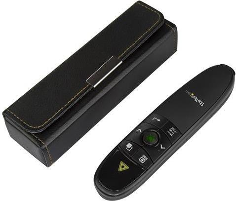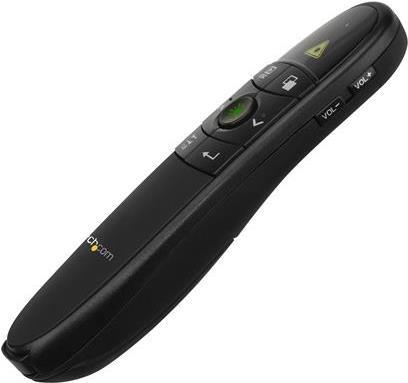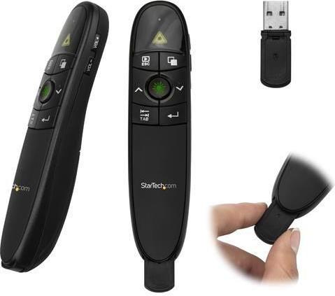 Mit dieser kabellosen Fernbedienung für Präsentationen können Sie Ihr Publikum ansprechen, seine Aufmerksamkeit auf sich ziehen und Ihre Präsentation steuern. Dies ist ideal für Präsentationen in großen Hörsälen oder Konferenzzentren.Lenken Sie die Aufmerksamkeit Ihres PublikumsDank des eingebauten grünen Laserpointers können Sie mit der Präsentationsfernbedienung die Aufmerksamkeit Ihres Publikums auf ausschlaggebende Informationen in Ihrer Präsentation lenken. Die Fernbedienung ist perfekt für PowerPoint-Präsentationen, Websites und andere Dokumente geeignet, die Sie mit Ihrem Publikum teilen möchten.Der grüne Laser funktioniert auf Oberflächen, auf denen rote Laser nicht angezeigt werden. Er ist gut auf hellen Projektionsflächen oder LCD/LED-HD-Bildschirmen sichtbar.Fesseln Sie Ihr PublikumDer Präsentationsklicker verfügt über eine drahtlose Reichweite von 27 m. So können Sie im gesamten Raum steuern, was auf dem Bildschirm angezeigt wird, und können sich frei bewegen und präsentieren, als wären Sie an Ihrem Computer.Sie haben folgende Möglichkeiten:Navigieren Sie durch Ihre FolienVerdunkeln Sie den Bildschirm, um die Aufmerksamkeit Ihres Publikums ausschließlich auf sich oder etwas anderes im Raum zu lenkenSteuern der Lautstärke eines VideosPräsentieren Sie an jedem OrtDie Fernbedienung verfügt über ein schlankes, ergonomisches Design und enthält die benötigten Batterien sowie eine Tasche, was den Transport sicher und einfach gestaltet. Sie können den kabellosen Empfänger in der Präsentationsfernbedienung aufbewahren, wenn Sie ihn nicht verwenden. Die Fernbedienung schaltet sich dann automatisch aus.Der USB-Empfänger kann mit praktisch jedem Mac- oder Windows-Computer verwendet werden. Schließen Sie den Empfänger einfach an Ihr Notebook an und schon können Sie präsentieren.Das Modell PRESREMOTEG wird von StarTech.com mit einer 2-Jahres-Garantie sowie mit einem kostenlosen technischen Support für die gesamte Produktlebensdauer angeboten.