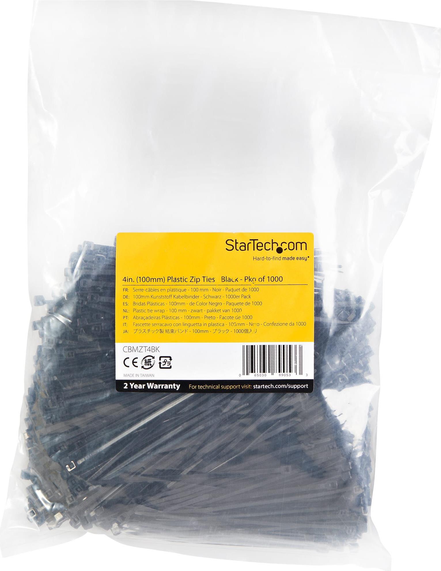 StarTech.com 10cm(4") Cable Ties, 2mm(1/16") wide, 22mm(7/8") Bundle Diameter, 8kg(18lb) Tensile Strength, Nylon Self Locking Zip Ties with Curved Tip, 94V-2/UL Listed, 1000 Pack, Black - Nylon 66 Plastic - TAA (CBMZT4BK) - Kabelbinder - TAA-konform |