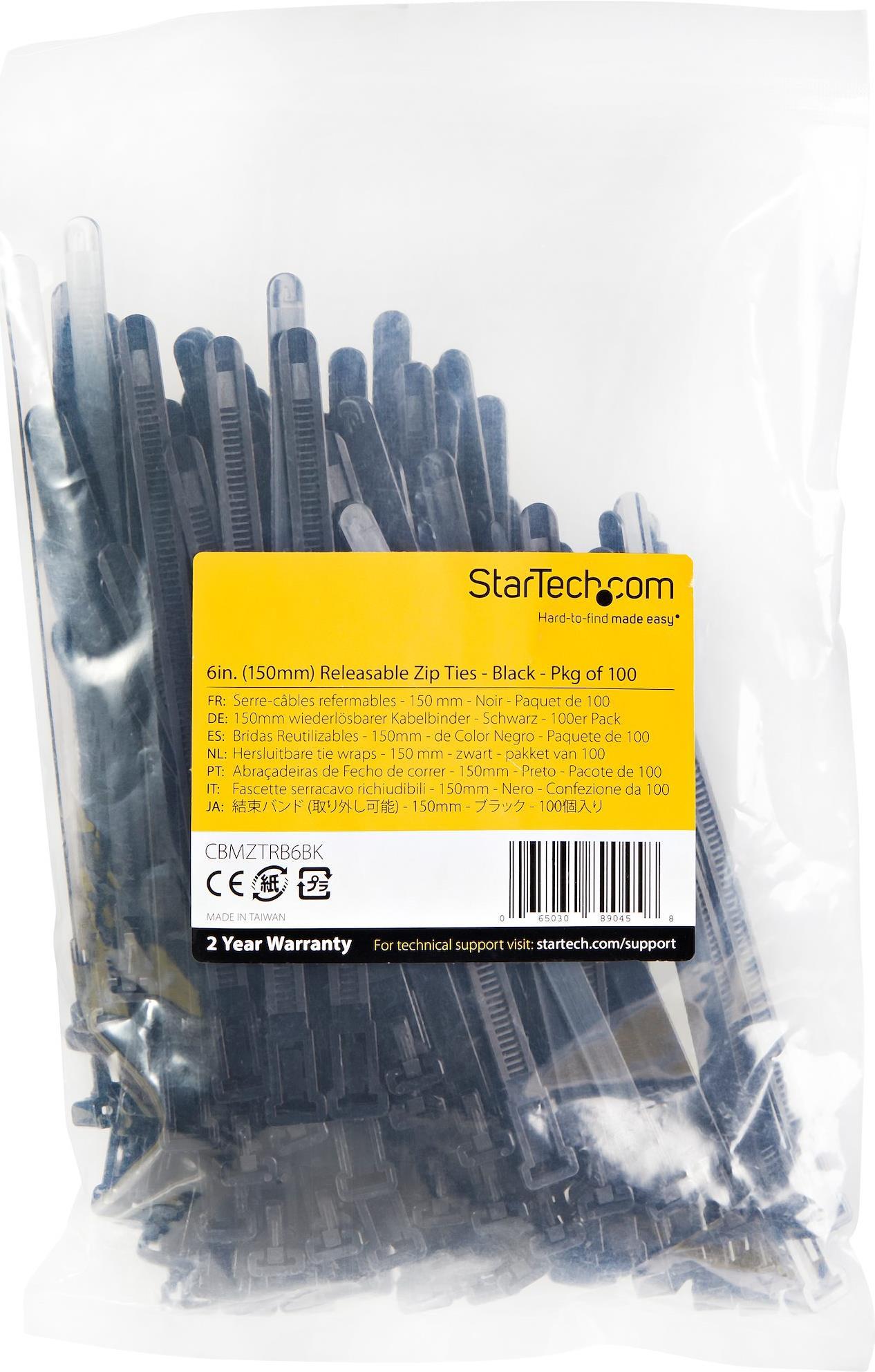 StarTech.com 15cm(6") Reusable Cable Ties, 7mm(1/4") wide, 35mm(1-3/8") Bundle Dia. 22kg(50lb) Tensile Strength, Releasable Nylon Ties, Indoor/Outdoor, 94V-2/UL Listed, 100 Pack, Black - Nylon 66 Plastic - TAA (CBMZTRB6BK) - Kabelbinder |