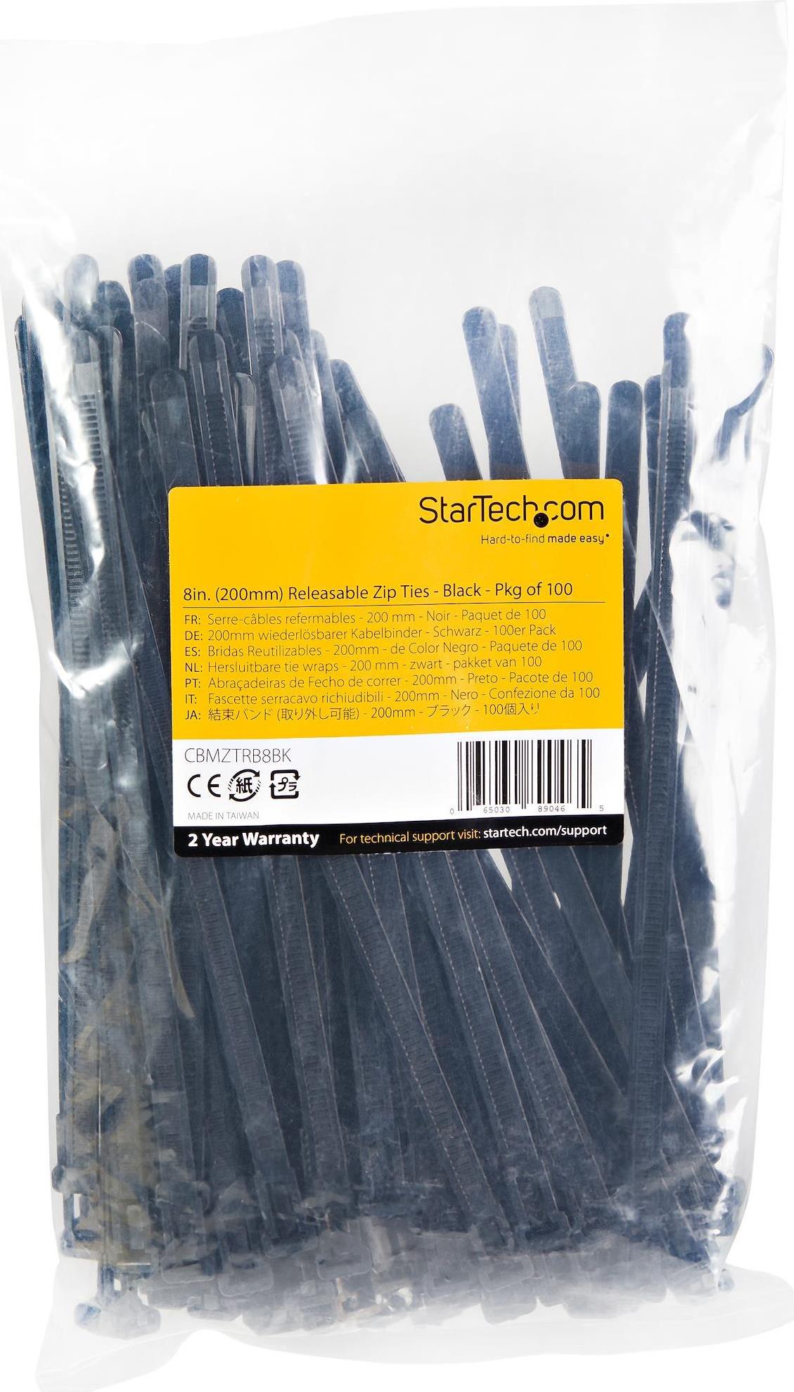 StarTech.com 20cm(8") Reusable Cable Ties, 7mm(1/4") wide, 50mm(1-7/8") Bundle Dia. 22kg(50lb) Tensile Strength, Releasable Nylon Ties, Indoor/Outdoor, 94V-2/UL Listed, 100 Pack, Black - Nylon 66 Plastic - TAA (CBMZTRB8BK) - Kabelbinder |