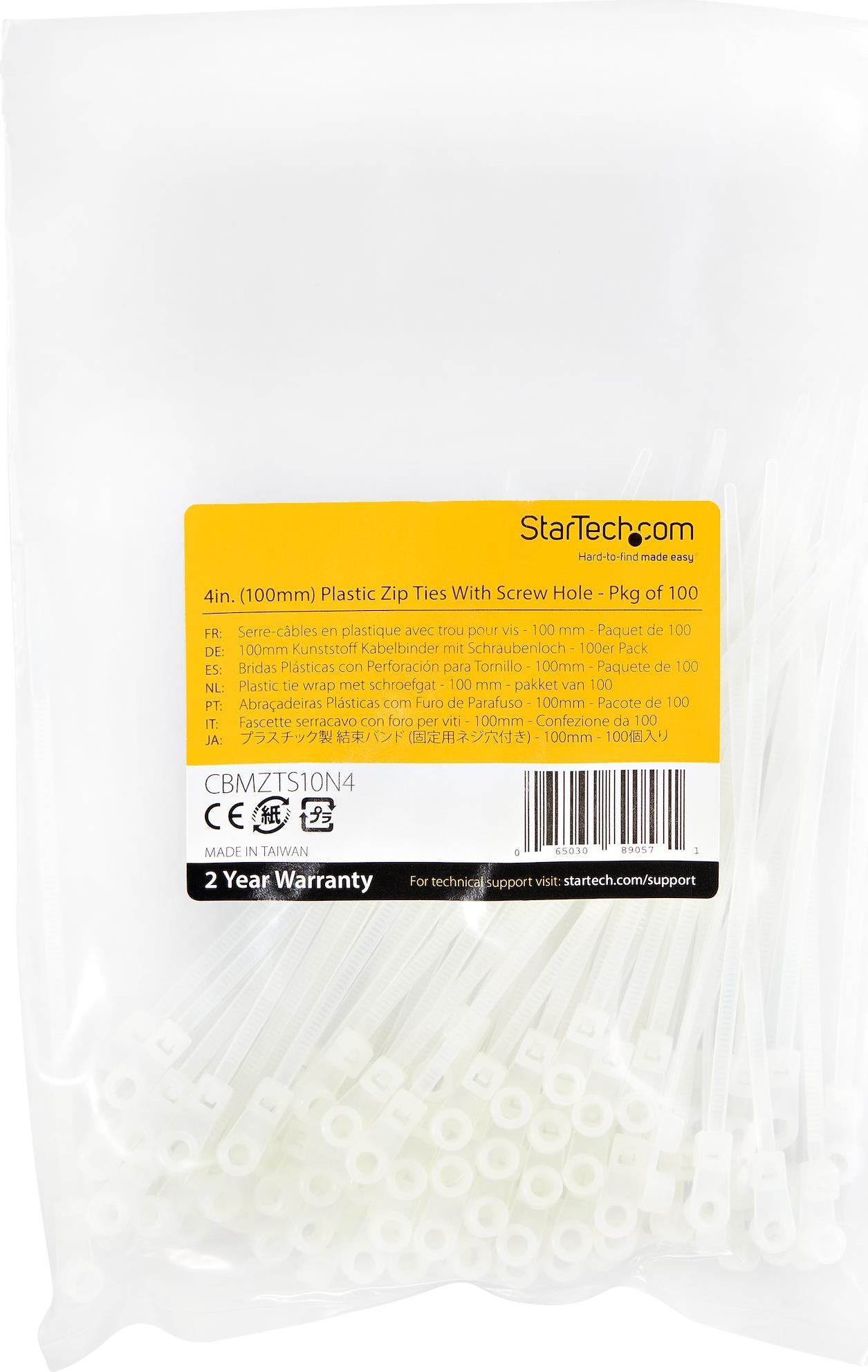 Mit diesen extra kleinen Kabelbindern mit Befestigungsloch können Sie bequem mehrere Kabel bündeln und sichern, um sie zu verlegen und zu organisieren. 100 weiße Kabelbinder sind im Lieferumfang enthalten, so dass Sie immer genügend zur Hand haben.Sichern und bündeln Sie Ihre Kabel mit einem montierbaren KabelbinderDiese Kabelbinder aus Kunststoff verfügen über ein Befestigungsloch, mit dem Sie Kabel bündeln und an einer Wand befestigen können. Sie haben eine Länge von 10 cm und sichern Kabelbündel mit einem Durchmesser von bis zu 24 mm. Sie sind schnell und einfach zu installieren oder zu entfernen, mit einstellbarer Spannung und einem einfachen einteiligen Design - perfekt für die Organisation von Netzwerkkabeln, Stromkabeln oder anderen Kabeln an Ihrem Heim- oder Büroarbeitsplatz.Industrielle StärkeDiese Kabelbinder bestehen aus strapazierfähigem Nylon 66-Material und sind robust und doch flexibel. Sie wurden rigoros getestet, um ein Gewicht von bis zu 8 kg zu tragen. Sie sind nach UL94 V-2 feuerfest, UL-zugelassen und CE & Lloyd\'\'s Register zertifiziert.Erhältlich in verschiedenen LängenUm jeder Anwendung gerecht zu werden, bietet StarTech.com eine große Auswahl an diesen Kabelbindern in verschiedenen Längen an:100 Stück - 110 mm weiße Kabelbinder mit Befestigungsloch (CBMZTS10N4)100 Stück - 171,5 mm weiße Kabelbinder mit Befestigungsloch (CBMZTS10N6)100 Stück - 219 mm weiße Kabelbinder mit Befestigungsloch (CBMZTS10N8)Diese Kabelbinder werden durch eine lebenslange StarTech.com-Garantie und einen kostenlosen 24/5 technischen Support unterstützt. StarTech.com ist seit über 30 Jahren die erste Wahl für IT-Profis.