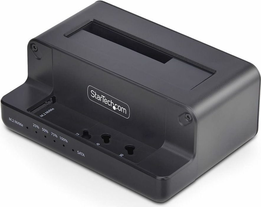 Der StarTech.com M.2 NVMe to 2.5/3.5" SATA Drive Duplicator bietet effiziente Funktionen zur Datenvervielfältigung. Dieses Gerät wurde für die Unterstützung der Formfaktoren M.2 2242/2260/2280 und 2,5" / 3,5" entwickelt und verfügt über ein robustes Design mit einem passiven Luftstromsystem, um eine optimale Leistung zu gewährleisten. Mit einer Duplizierungsgeschwindigkeit von 27 GB pro Minute ermöglicht es schnelle Übertragungen und macht den Prozess des Sicherns oder Klonens von Laufwerken effizient. Ausgestattet mit grundlegenden Funktionen wie TRIM-Management und SMART-Management ist dieser Duplikator ideal für die Aufrechterhaltung der Gesundheit von Laufwerken. Die Hot-Swap-Funktionalität sorgt für zusätzlichen Komfort, da Benutzer Laufwerke problemlos austauschen können.
