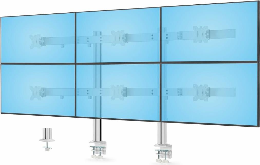 Diese Monitorhalterung ist so konzipiert, dass sie bis zu sechs 32-Zoll-Bildschirme tragen kann. So entsteht eine ergonomische Multi-Monitor-Einrichtung, die einen großen Sichtbereich für die Produktivität bietet.