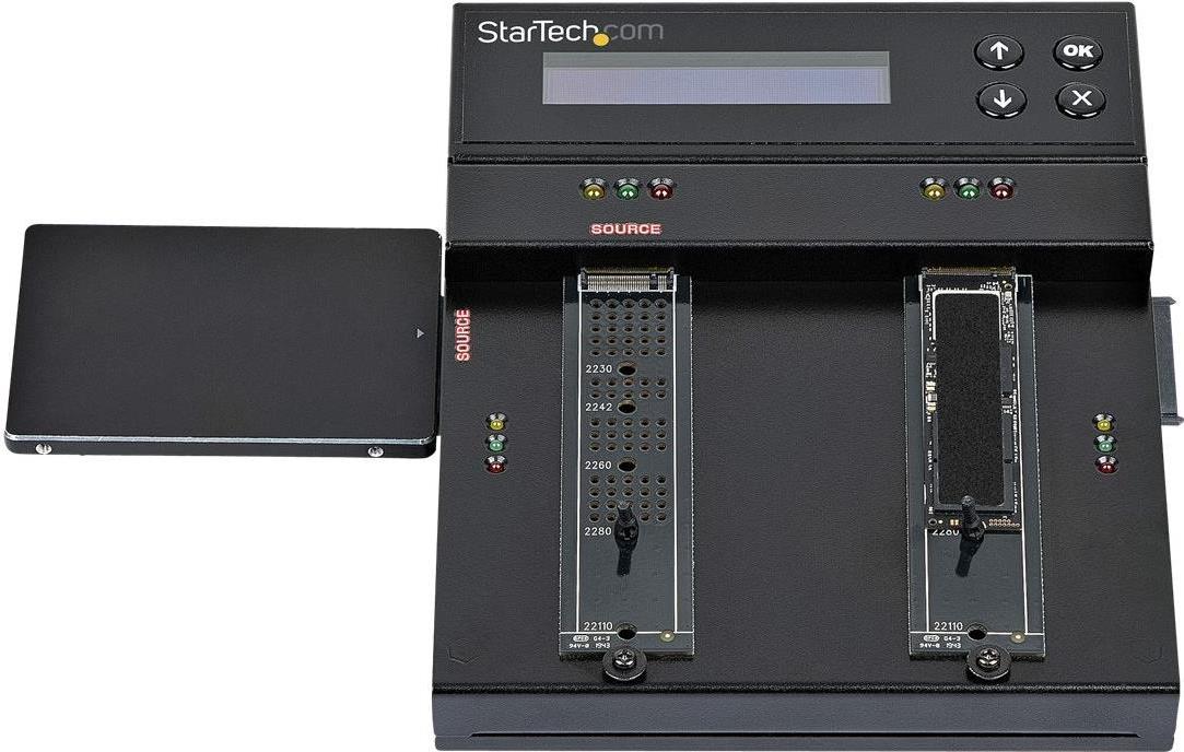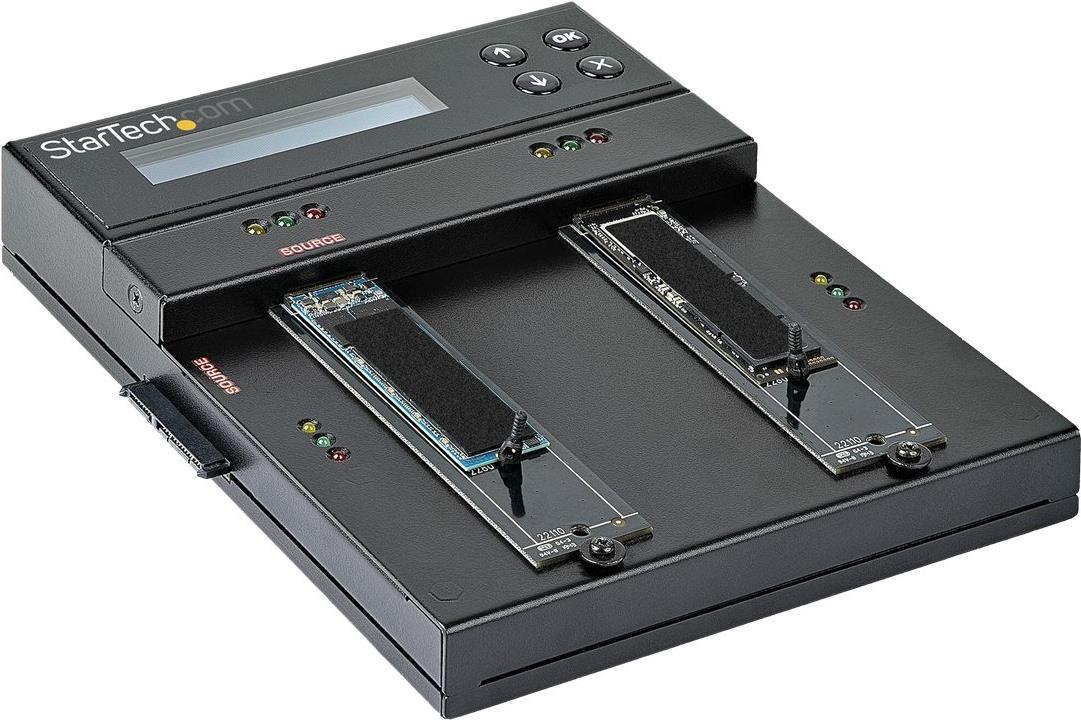 Dieser flexible 1-zu-1 Laufwerk-Duplizierer und Löscher bietet eine eigenständige Lösung zum Klonen und Bereinigen von Festplatten (HDD) und Solid-State-Laufwerken (SSD) ohne Computer oder Software. Der Laufwerk-Duplizierer/Bereiniger kann Laufwerke mit einer Geschwindigkeit von bis zu 7,5 GB pro Minute klonen und unterstützt eine Vielzahl von Laufwerkstypen: • M.2 PCIe-Laufwerke (Größe 2230/2242/2260/2280/22110) • M.2 SATA-Laufwerke (Größe 2230/2242/2260/2280/22110) • 2,5 Zoll SATA-Laufwerke • 3,5 Zoll SATA-Laufwerke.