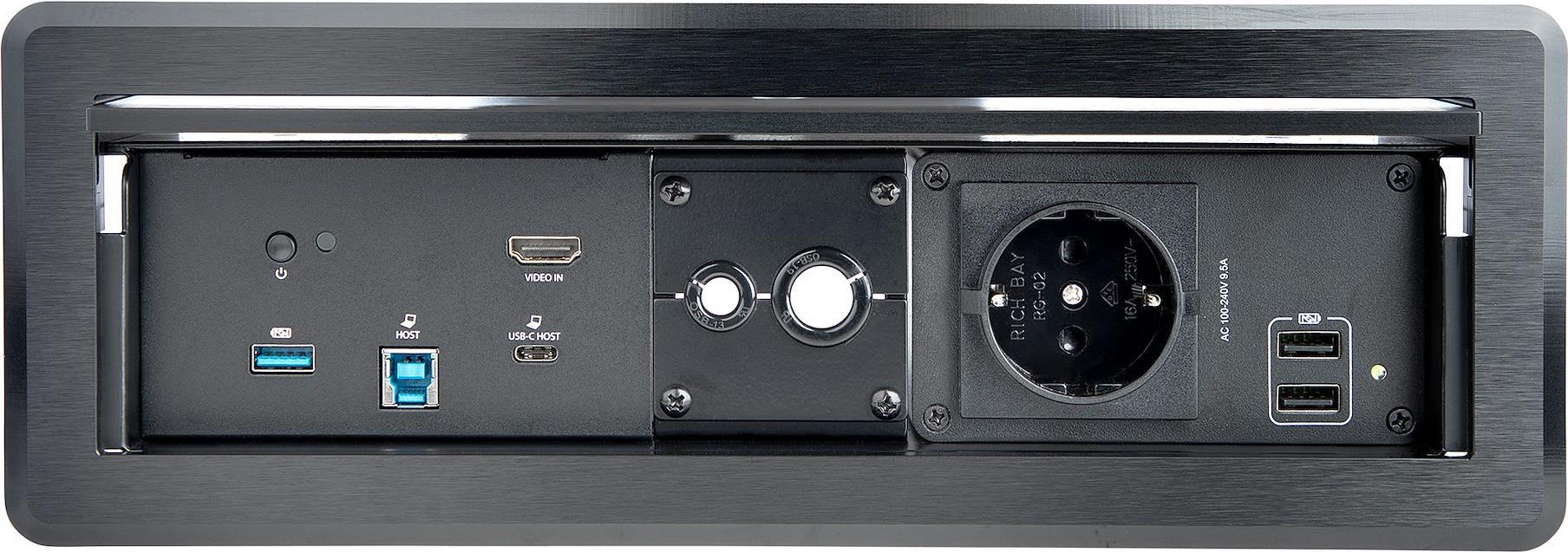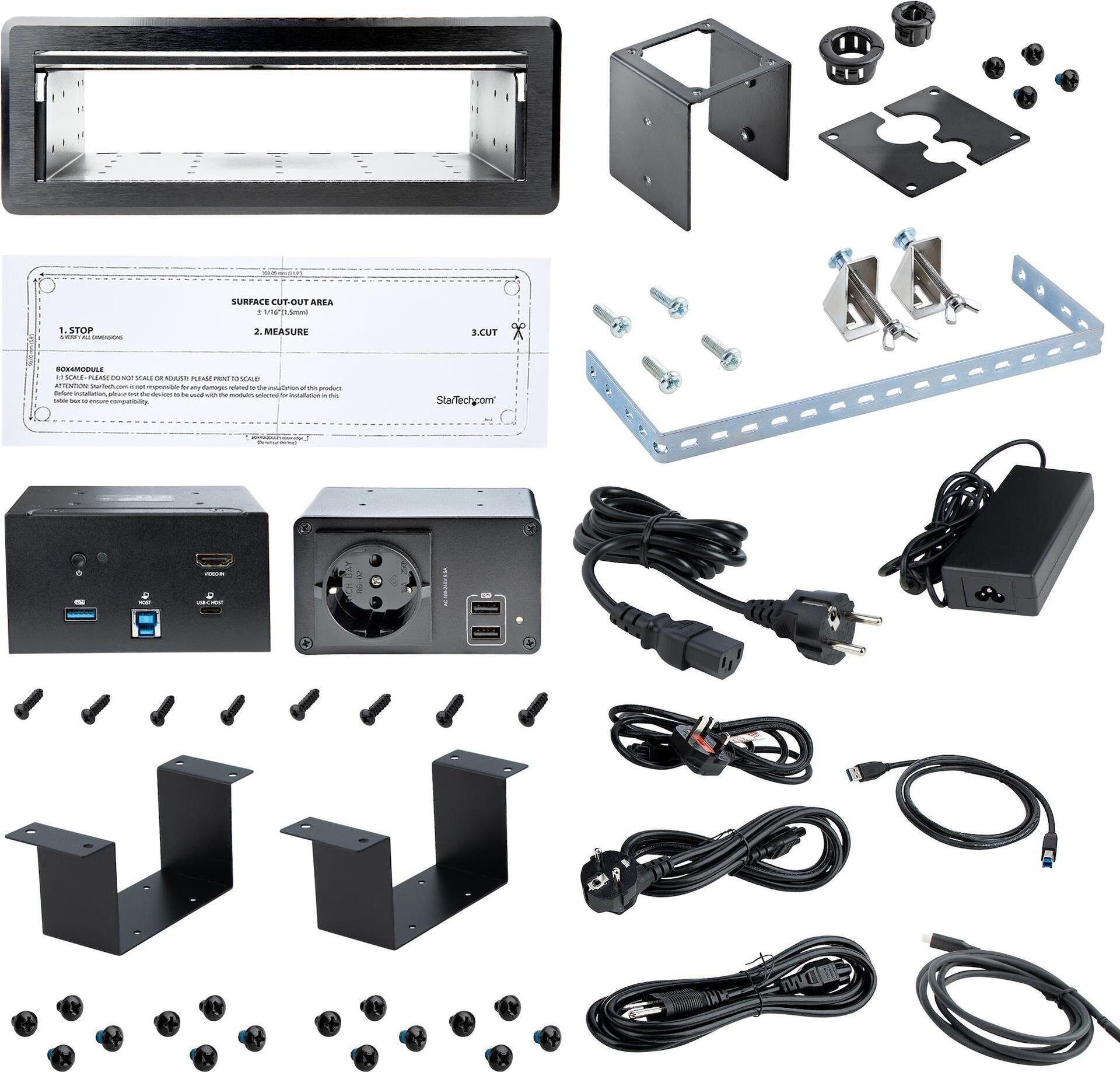 Dieses Konferenztisch-Konnektivitätsbox-Paket bietet Stromversorgungs- und Lademöglichkeiten an den erforderlichen Stellen und ergänzt Ihren Konferenzraum, Ihr Klassenzimmer oder Ihren Gruppenraum um Dockingstation-Funktionen. Das StarTech.com-Paket enthält drei Produkte, mit denen Sie eine praktische, sofort einsatzbereite Konnektivitätslösung erhalten: • Steckdosenmodul (MOD4POWEREU) • Laptop-Docking-Modul (MOD4DOCKACPD) • Konferenztisch-Konnektivitätsbox mit zwei Modulen (BOX4MODULE).