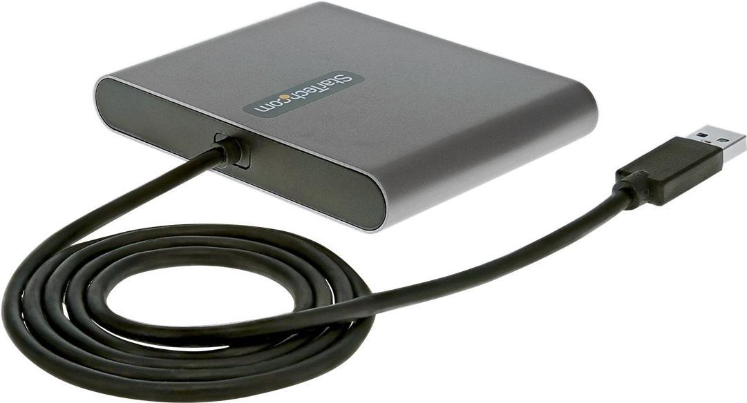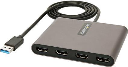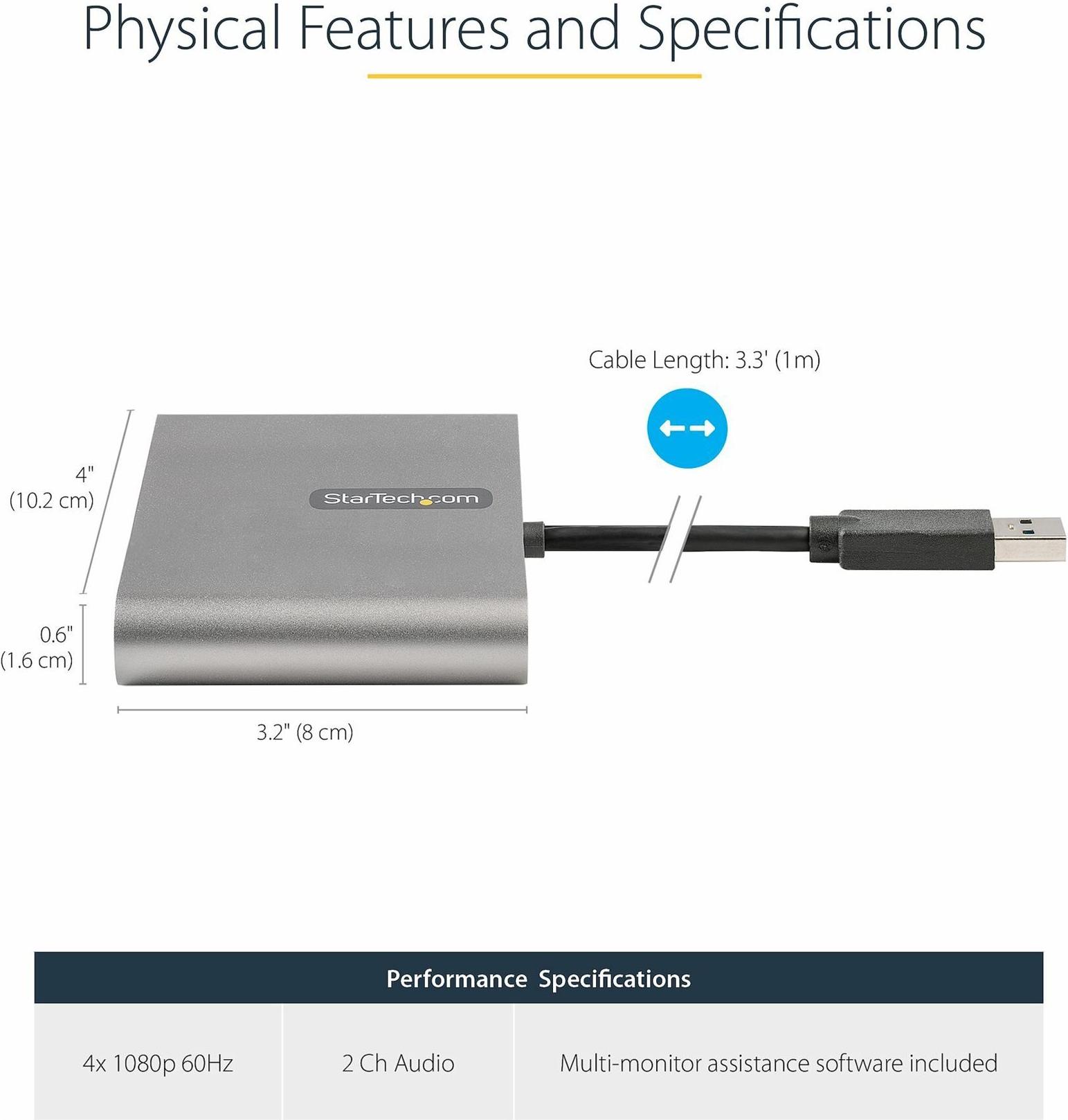 Externer USB 3.0 Videoadapter | 4x 1080p | Quad MonitorMit diesem USB 3.0 auf HDMI® Adapter können Sie Ihren Desktop erweitern, indem Sie einen Laptop oder Desktop-Computer über einen einzigen Anschluss mit USB-Typ-A vier unabhängige HDMI-Monitore oder -Displays hinzufügen.Steigern Sie Ihre ProduktivitätDieser USB-A auf 4 HDMI Adapter verfügt über vier Video-Ausgänge, um Ihre Produktivität durch eine größere Bildschirmfläche zu steigern. Mit mehreren Monitoren können Sie auf mehrere Anwendungen gleichzeitig zugreifen und auf einem Bildschirm arbeiten, während Sie auf dem anderen Referenzmaterial anzeigen. Verwenden Sie den USB auf HDMI Adapter für mehrere Monitore, um Ihre Displays zu erweitern oder zu spiegeln oder erstellen Sie eine auffällige Videowand.Hoch auflösendes Video & AudioDank der USB 3.0 Schnittstelle liefert dieser Adapter-Dongle für vier Monitore HD-Auflösungen von bis zu 1920x1080 (1080p) an allen vier Anschlüssen. Der Adapter unterstützt auch 2-Kanal-Audio über HDMI.Einfache EinrichtungDer USB-Typ-A auf HDMI Adapter-Konverter verfügt über ein 1 m langes angeschlossenes USB-A Kabel, das zusätzlichen Abstand zwischen dem Adapter und dem Host-Gerät bietet und so eine flexible Einrichtung ermöglicht Es unterstützt auch eine automatische Treiberinstallation für eine einfache Bedienung.Der externe Videoadapter wird über den Bus betrieben, ohne dass eine externe Stromversorgung erforderlich ist.Multi-Monitor Assistant SoftwareDie Multi-Monitor Assistant Anwendung bietet eine Benutzeroberfläche, die Benutzern beim Multitasking hilft und es Ihnen ermöglicht, schnell zwischen verschiedenen Monitoren zu wechseln. Sie ermöglicht zusätzliche Funktionen, die den Benutzern beim Drag and Drop, optionalen Zoomen, bei der geteilten Skalierung und beim Kaskadieren von Fenstern auf dem Hauptdisplay sowie beim Erstellen einer dynamischen Video- oder Matrixwand helfen.Das Modell USB32HD4 wird von StarTech.com mit einer 3-jährigen Garantie sowie lebenslangem kostenlosem technischem Support angeboten.Hinweis:Alle vier Monitore müssen über die gleiche Größe und Auflösung verfügen, um eine Videowand erstellen zu können.Der Adapter kann nur bis zu zwei zusätzliche Displays spiegeln.The StarTech.com Advantage