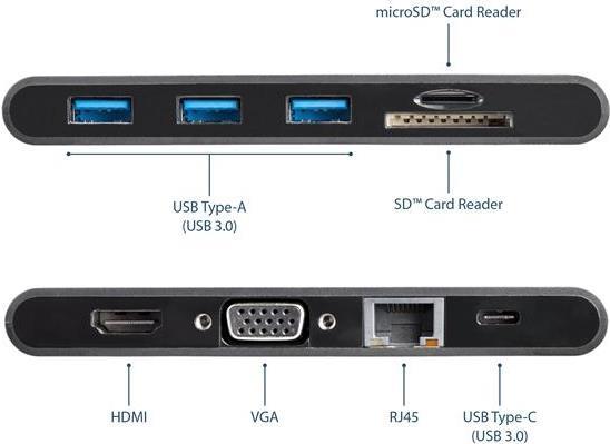 | Produktbeschreibung | StarTech.com USB-C Multiport Adapter mit HDMI und VGA - Mac und Windows - 3x USB 3.0 - SD/ micro SD - PD 3.0 - MacBook Pro USB C Adapter - externer Videoadapter - Schwarz |