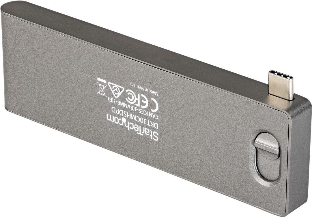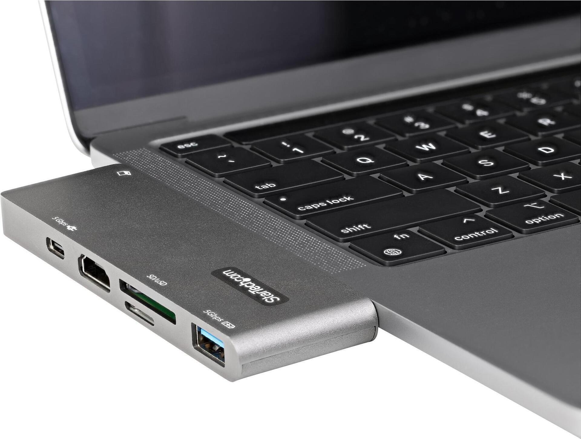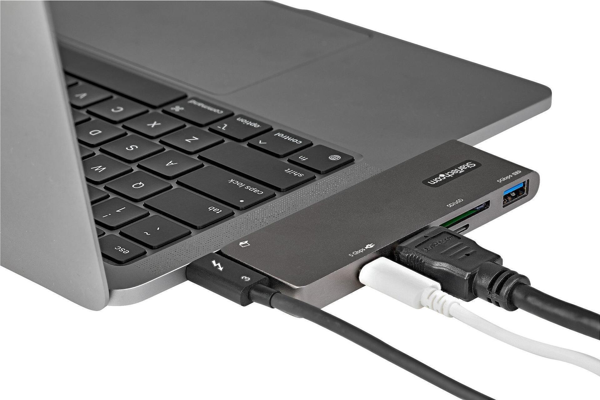 Dieser USB-C Multiport-Adapter mit HDMI verwandelt Ihr MacBook Pro, MacBook Air (inkl. M1s), Google Pixelbook und andere USB-C Tablets und Laptops in eine Workstation, wo immer Sie auch sind. Der USB Typ-C Multiport Adapter bietet einen 4K 30 Hz HDMI Videoausgang, einen USB Typ-C Anschluss (Daten/Strom), einen USB 3.2 Typ A Anschluss der zweiten Generation (5 Gbit/s), einen SD und MicroSD (uSD)-Kartenleser, alle über eine Verbindung zum USB-C oder Thunderbolt Anschluss Ihres Laptops. Der Adapter bietet erweitertes Aufladen über USB 100 W Stromversorgung 3.0 und macht ein angeschlossenes Kabel dank des ausziehbaren USB-C Anschlusses überflüssig, da dieser direkt an Ihren USB-C Host angeschlossen werden kann, ohne dass ein angeschlossenes Kabel erforderlich ist.
