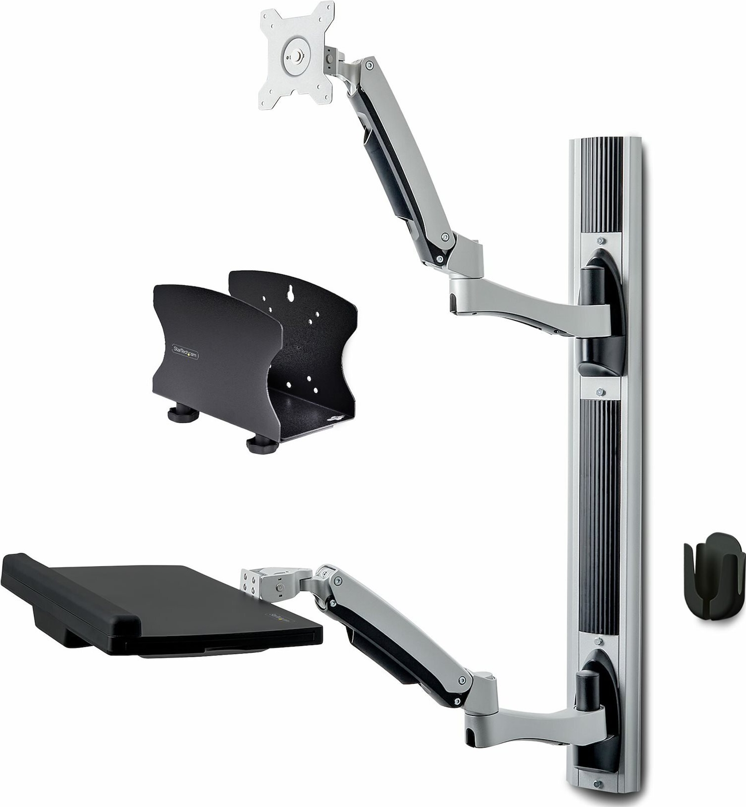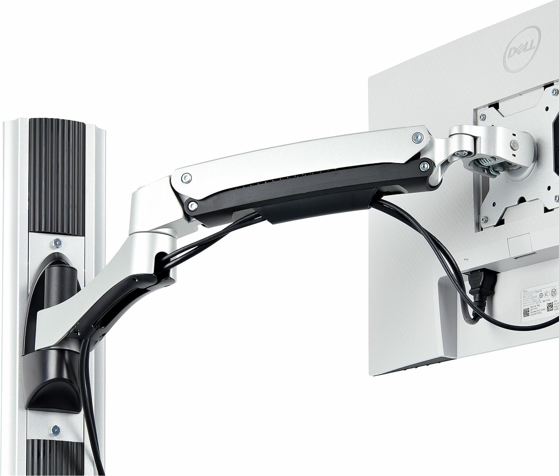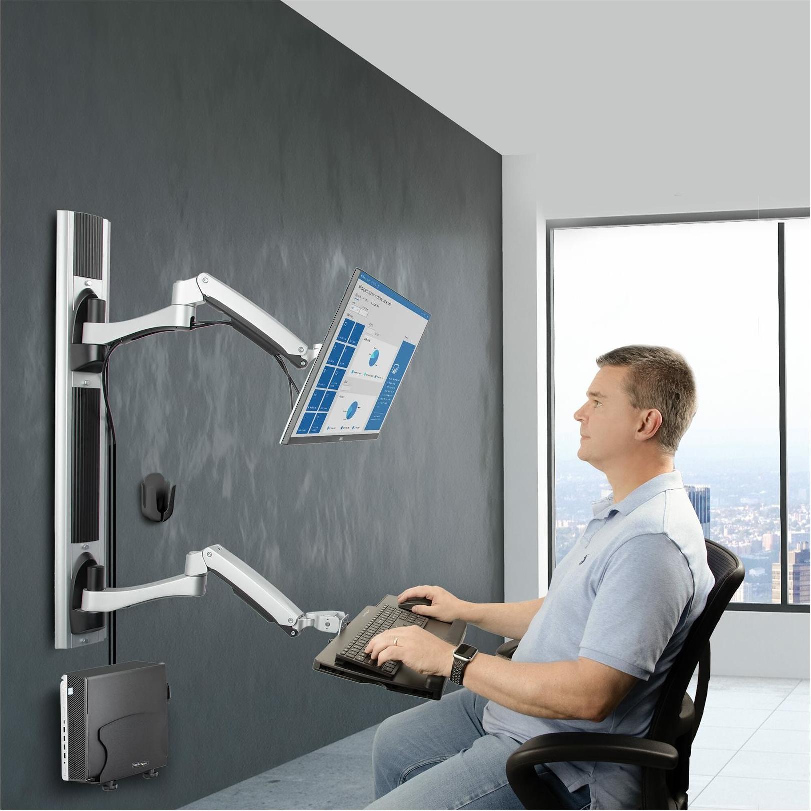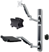 Mechanische Federn in den Monitor- und Tastaturarmen ermöglichen eine unabhängige, werkzeuglose Höhenverstellung um bis zu 31,5 cm per Knopfdruck. Für weitere Höheneinstellungen können die Arme entlang der Wandschiene (88 cm) verschoben werden.