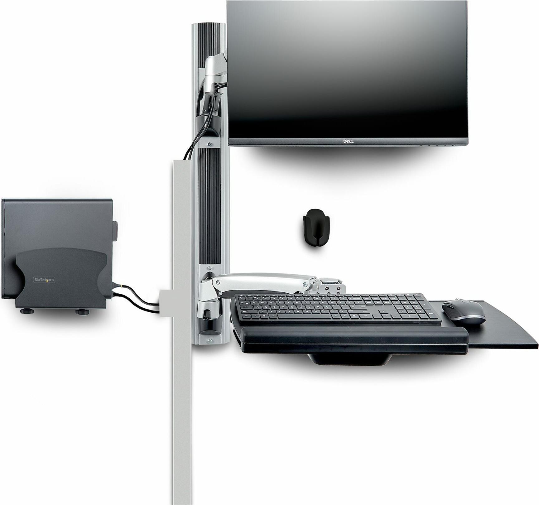 Optimieren Sie Ihren Arbeitsbereich, indem Sie das Desktop-Computergehäuse mit der mitgelieferten Halterung (Teil 2NS-CPU-WALL-MOUNT) unter der Tastaturablage an der Wand befestigen. Das offene Design der PC-Halterung ermöglicht den ungehinderten Zugriff auf Laufwerksschächte, Peripherieanschlüsse und Verkabelung.