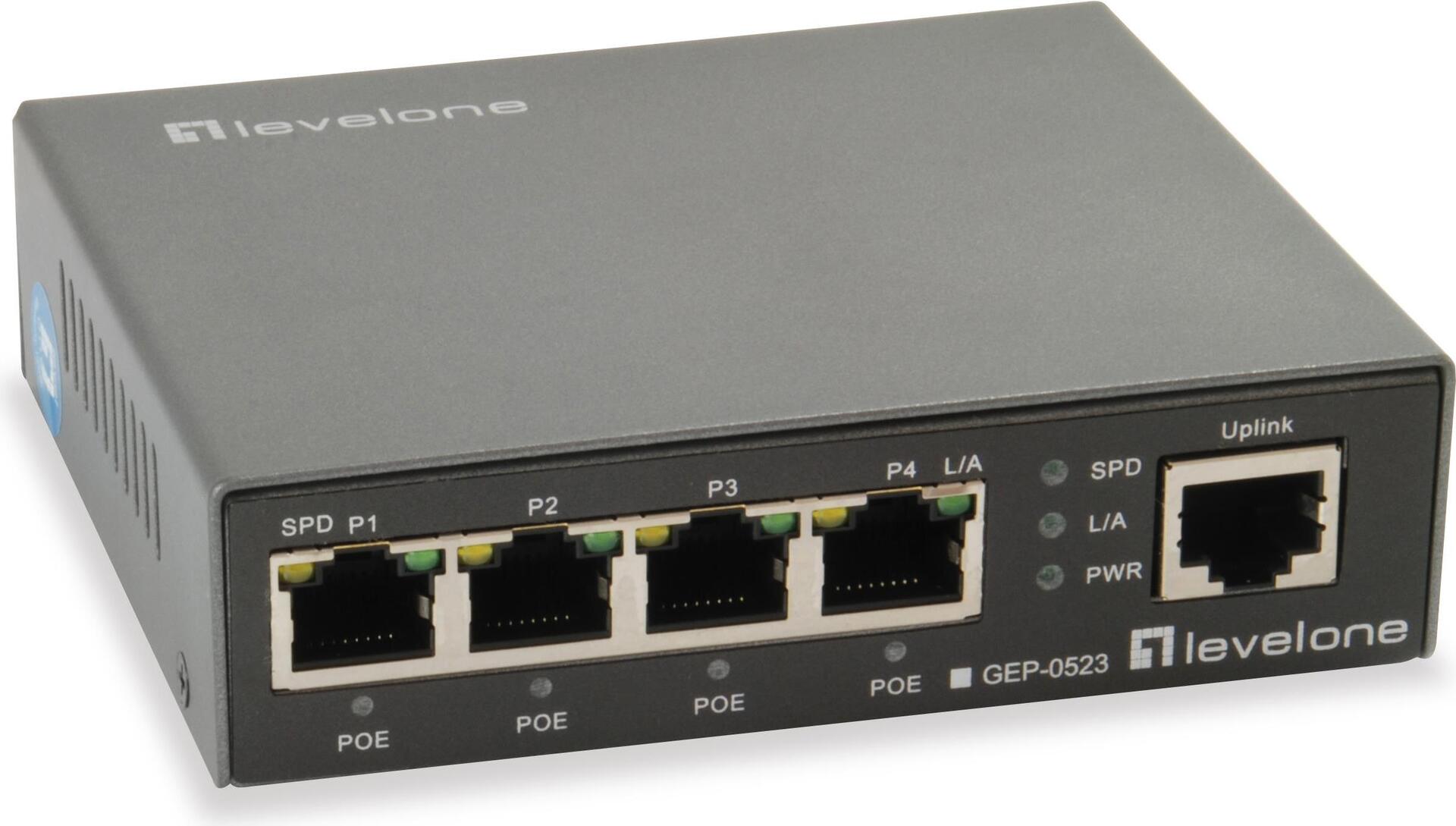Der LevelOne GEP-0523 ist ein Gigabit Ethernet PoE Switch mit insgesamt 5 Ports, davon steht einer als Uplink-Port sowie 4 Ports für Power over Ethernet zur Verfügung. Pro PoE-Port ist eine Stromversorgung bis zu 30W möglich. Das gesamte PoE-Leistungsbudget beträgt 60W. Es ist eine ideale Lösung, wenn Büro- und Heimanwender eine Kombination aus PoE- und nicht-PoE-fähigen Geräten verwenden.Die vier PoE-fähigen Ports des GEP-0523 sind somit die ideale Lösung für Büroanwender, die PoE-fähige Geräte am Arbeitsplatz einsetzen. Dies kann eine Mischung aus PoE-IP-Telefonen, PoE-Wi-Fi-APs und PoE-IP-Cams beinhalten. Er ist die perfekte Lösung für Büros, die ihre Büroausstattung und LAN-Infrastruktur auf PoE-Fähigkeit umstellen oder mit Gigabit Leistung aufwerten wollen. Der Switch erkennt automatisch das angeschlossene IEEE 802.3at/af Standardgerät und stellt diesen Geräten Strom und Daten über ein einziges Kabel zur Verfügung.Darüber hinaus ermöglicht der GEP-0523 es Benutzern, eine stabile und zuverlässige Hochgeschwindigkeits-LAN-Umgebung mit Store-and-Forward-Switching-Architektur, Paketfehlerfilterung und blockadefreier Paketweiterleitung bereitzustellen. Die 802.3x-Durchflusskontrollmechanismen funktionieren jeweils im Voll- und Halbduplexbetrieb. Dieses Gerät unterstützt das N-Way-Auto-Negotiationsprotokoll, das Netzwerkgeschwindigkeit und Duplex-Modus automatisch erkennt.