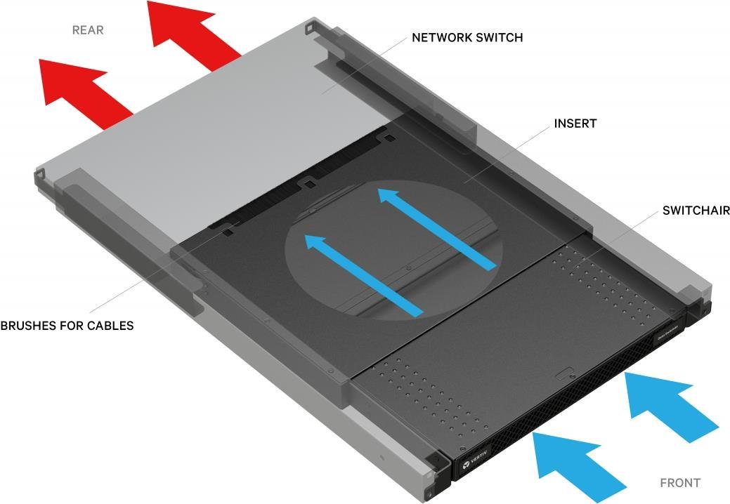 Netzwerk-Switches, Load Balancer und Router befinden sich typischerweise am oberen und hinteren Teil des Racks, weg vom Kaltgang-Luftstrom an der Vorderseite des Schranks. Da diese Anordnung die Luftströmung von kalter Luft von der Vorderseite des Racks zu den Lufteinlässen der Netzwerkschaltergeräte erschwert, besteht die Gefahr eines Ausfalls im Laufe der Zeit. SwitchAir hilft, Fehler zu vermeiden, indem kühle Luft von der Vorderseite des Racks zu den Lufteinlässen geleitet wird, unabhängig davon, wo das Gerät montiert ist.