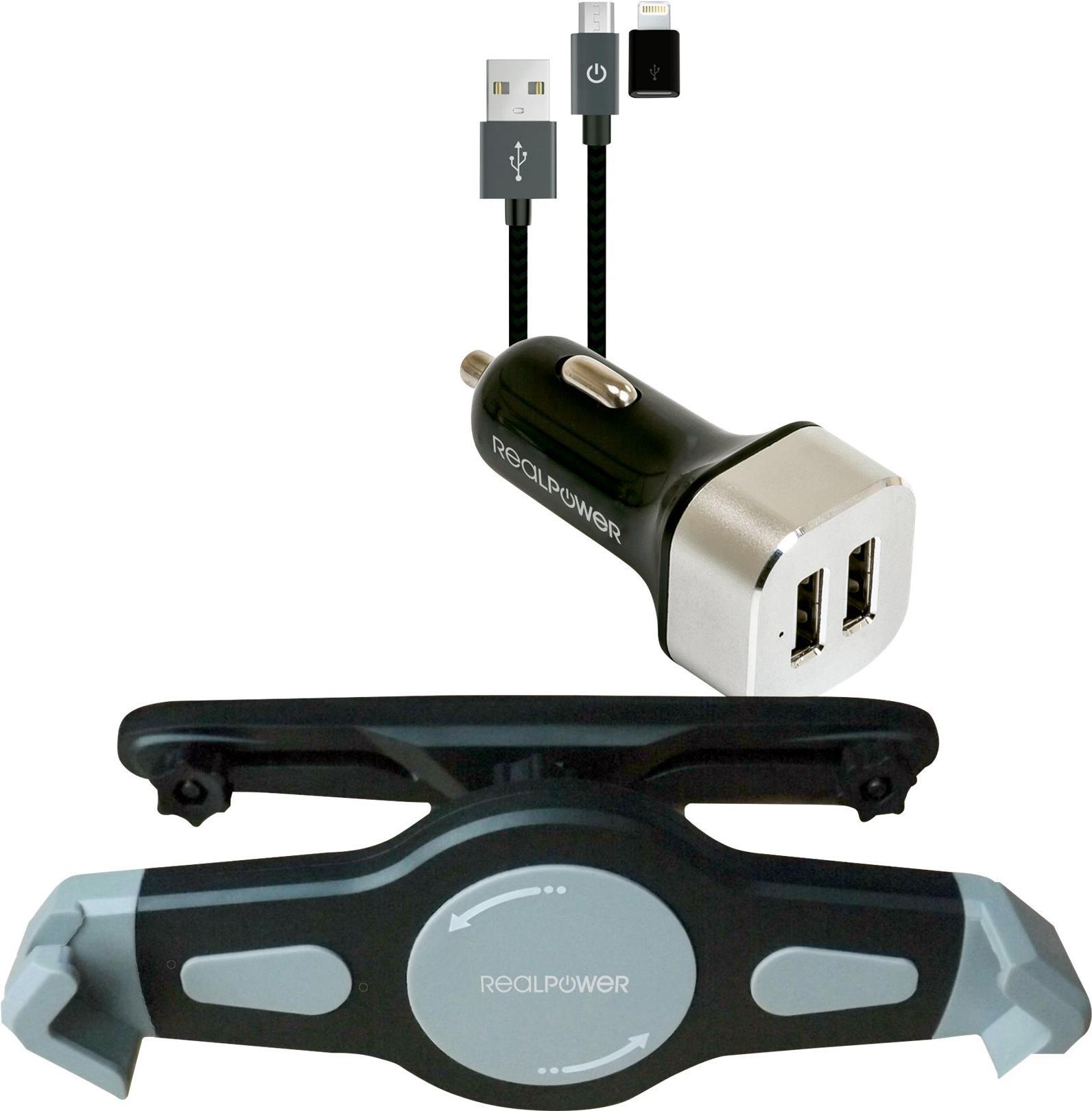 Das Rundum-sorglos-Paket für das Tablet bietet ultron mit dem RealPower Tablet Car Set. Die Ladestation für den Zigarettenanzünder bietet zwei USB-Ports zum Laden von Tablet und Co. Auch für Apple-Devices hält das Set den entsprechenden Adapter bereit. Die universelle Kopfstützen-Halterung bewahrt das Tablet während der Fahrt sicher auf und positioniert es optimal, um den Fahrgästen auf den Rückbänken die Fahrtzeit mit einem Video zu verkürzen.