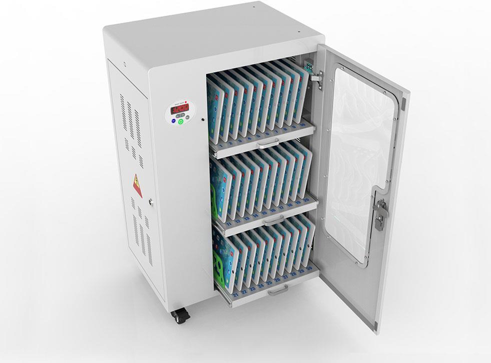 Mit dem innovativen Tablet-Ladewagen begleitet Sie Good Connections auf den Weg der Digitalisierung und sorgt dafür, dass ihre Geräte immer einsatzbereit und geladen sind, wenn sie gebraucht werden. Sichere Aufbewahrung und energieeffiziente sowie ressourcenschonende Ladetechnik – durch seine Flexibilität und Vielseitigkeit ist der UL-zertifizierte Tablet-Ladewagen von Good Connections der ideale Begleiter für Ihr Projekt im Bildungswesen, Gesundheitswesen, Industrie, Tagungsstätten, Hotels und der Gastronomie. Machen Sie sich keine Gedanken mehr darüber ob Sie das passende Ladegerät für ihr Tablet zur Hand haben, denn durch die USB-Ports mit intelligenter IC-Ladesteuerung benötigen Sie nur noch eine Standard-Steckdose für bis zu 65 Tablets. Eine in jeder Ladeebene angebrachte UV-C Lampe sorgt umweltfreundlich und ohne Chemie für sterilere Verhältnisse und eine verbesserte Hygiene. Die ausziehbaren und nummerierten Fächer dienen der einfachen Zuordnung der Geräte zu den einzelnen Nutzern.