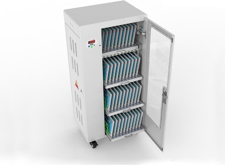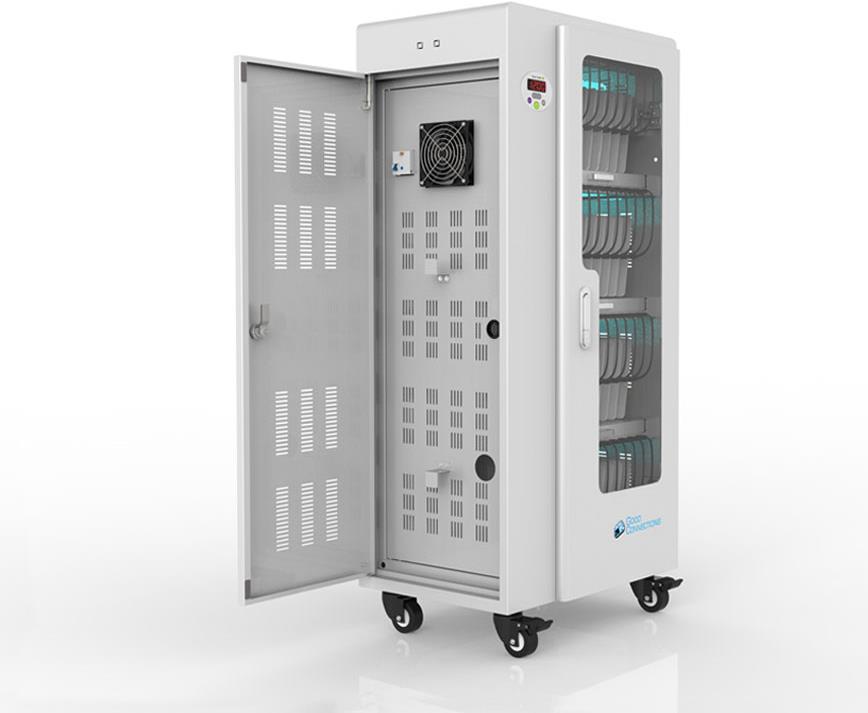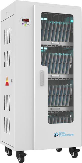 Mit dem innovativen Tablet-Ladewagen begleitet Sie Good Connections auf den Weg der Digitalisierung und sorgt dafür, dass ihre Geräte immer einsatzbereit und geladen sind, wenn sie gebraucht werden. Sichere Aufbewahrung und energieeffiziente sowie ressourcenschonende Ladetechnik – durch seine Flexibilität und Vielseitigkeit ist der UL-zertifizierte Tablet-Ladewagen von Good Connections der ideale Begleiter für Ihr Projekt im Bildungswesen, Gesundheitswesen, Industrie, Tagungsstätten, Hotels und der Gastronomie. Machen Sie sich keine Gedanken mehr darüber ob Sie das passende Ladegerät für ihr Tablet zur Hand haben, denn durch die USB-Ports mit intelligenter IC-Ladesteuerung benötigen Sie nur noch eine Standard-Steckdose für bis zu 65 Tablets. Eine in jeder Ladeebene angebrachte UV-C Lampe sorgt umweltfreundlich und ohne Chemie für sterilere Verhältnisse und eine verbesserte Hygiene. Die ausziehbaren und nummerierten Fächer dienen der einfachen Zuordnung der Geräte zu den einzelnen Nutzern.