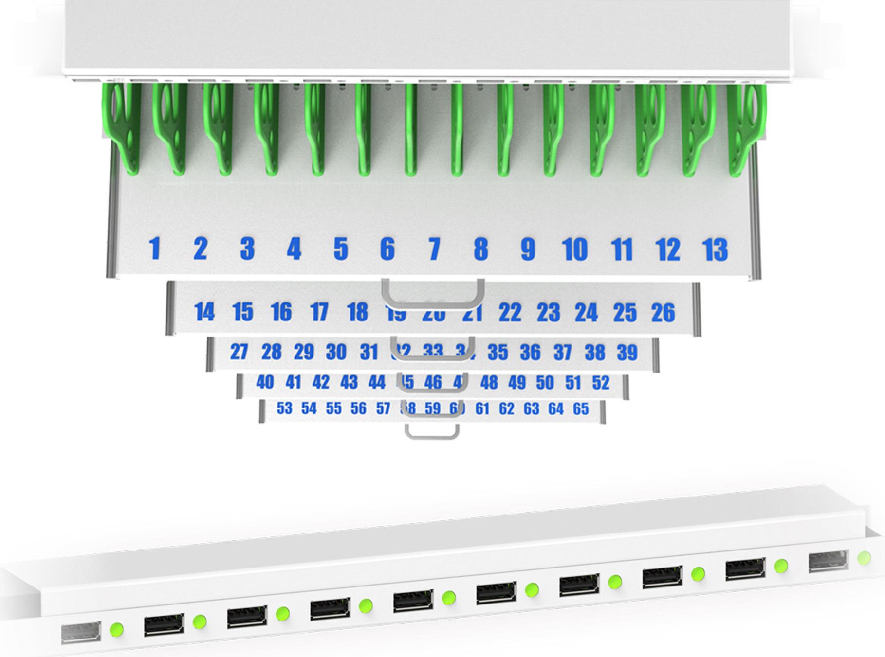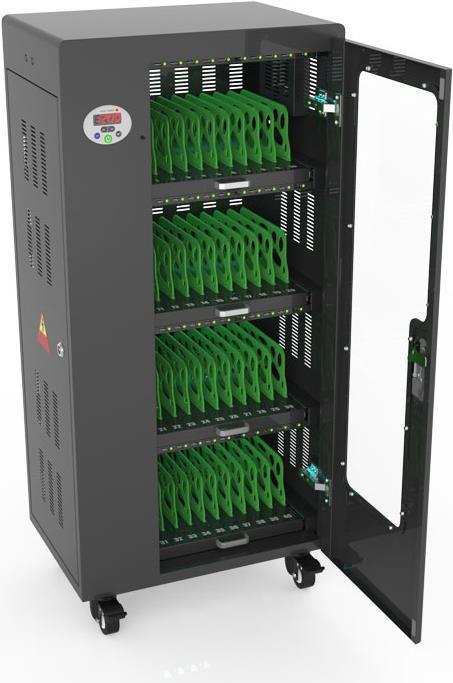 Mit dem innovativen Tablet-Ladewagen begleitet Sie Good Connections auf den Weg der Digitalisierung und sorgt dafür, dass ihre Geräte immer einsatzbereit und geladen sind, wenn sie gebraucht werden. Sichere Aufbewahrung und energieeffiziente sowie ressourcenschonende Ladetechnik – durch seine Flexibilität und Vielseitigkeit ist der UL-zertifizierte Tablet-Ladewagen von Good Connections der ideale Begleiter für Ihr Projekt im Bildungswesen, Gesundheitswesen, Industrie, Tagungsstätten, Hotels und der Gastronomie. Machen Sie sich keine Gedanken mehr darüber ob Sie das passende Ladegerät für ihr Tablet zur Hand haben, denn durch die USB-Ports mit intelligenter IC-Ladesteuerung benötigen Sie nur noch eine Standard-Steckdose für bis zu 65 Tablets. Eine in jeder Ladeebene angebrachte UV-C Lampe sorgt umweltfreundlich und ohne Chemie für sterilere Verhältnisse und eine verbesserte Hygiene. Die ausziehbaren und nummerierten Fächer dienen der einfachen Zuordnung der Geräte zu den einzelnen Nutzern.
