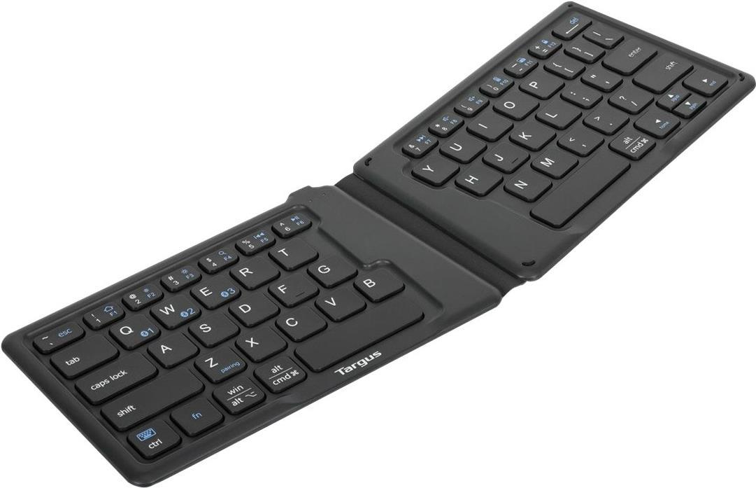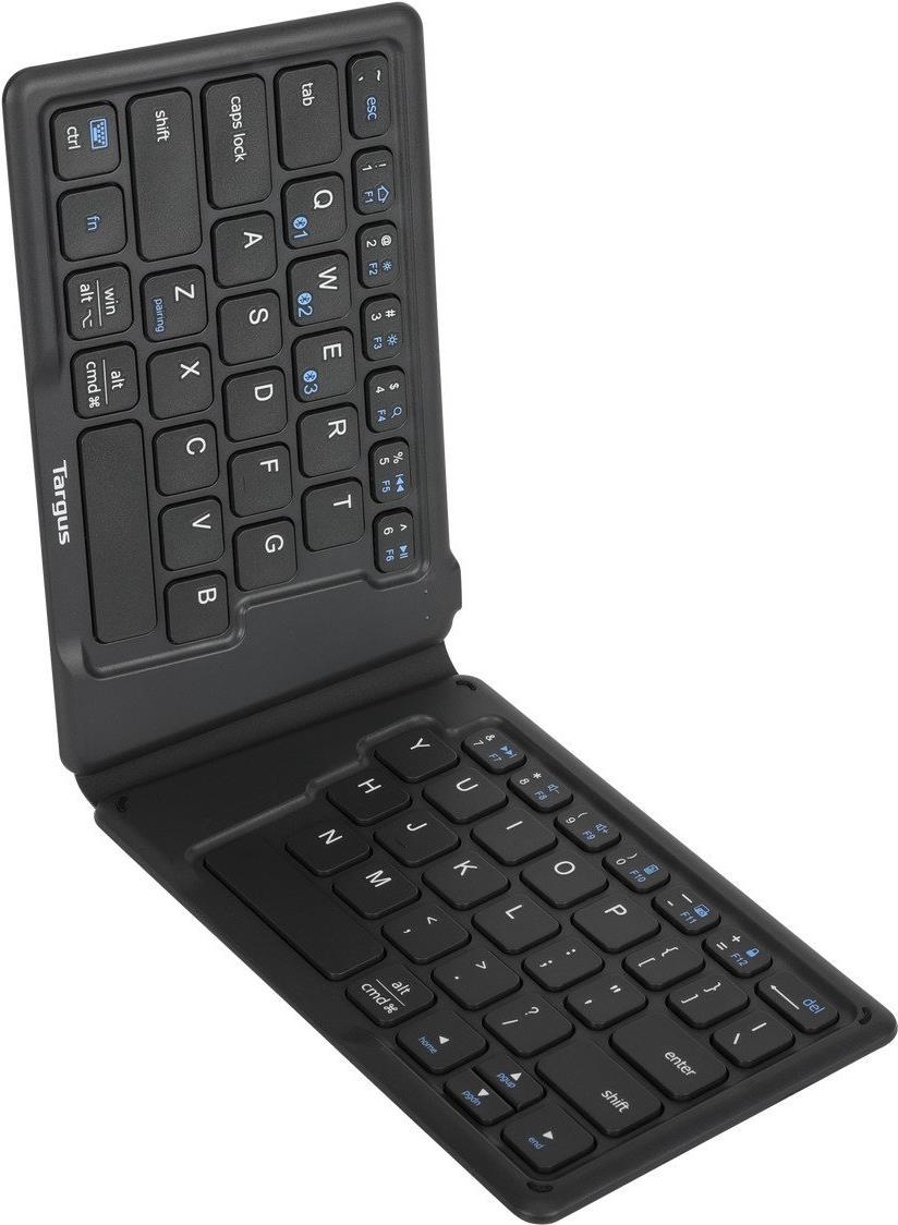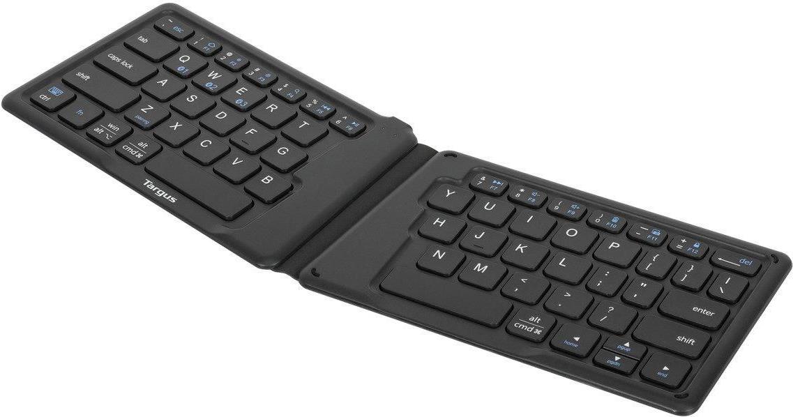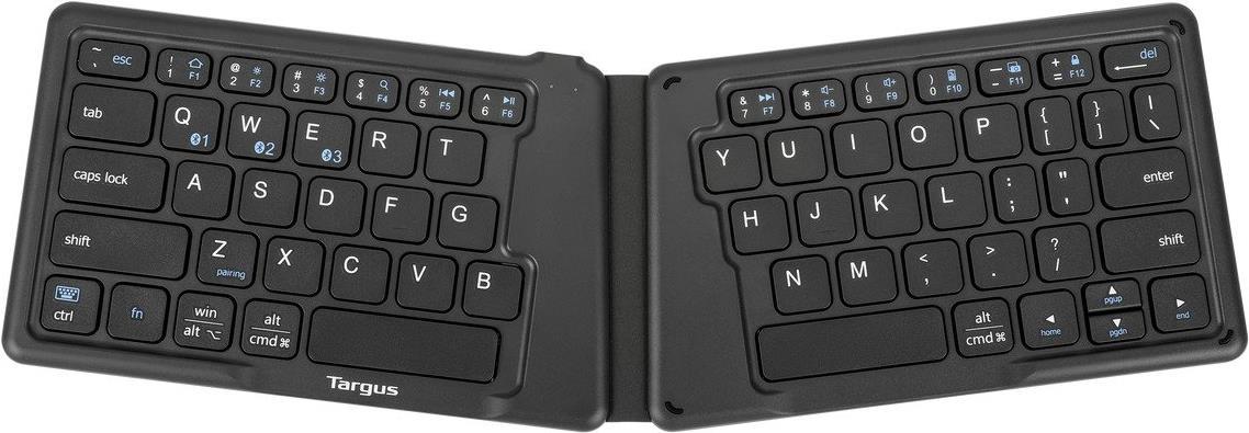Targus Folding Ergo UK-Layout Keyboard mit antimikrobiellem Schutz. Die ergonomische Tastatur im Taschenformat bietet universelle Kompatibilität und kann bis zu drei Geräte koppeln und in ihrem Speicher ablegen.